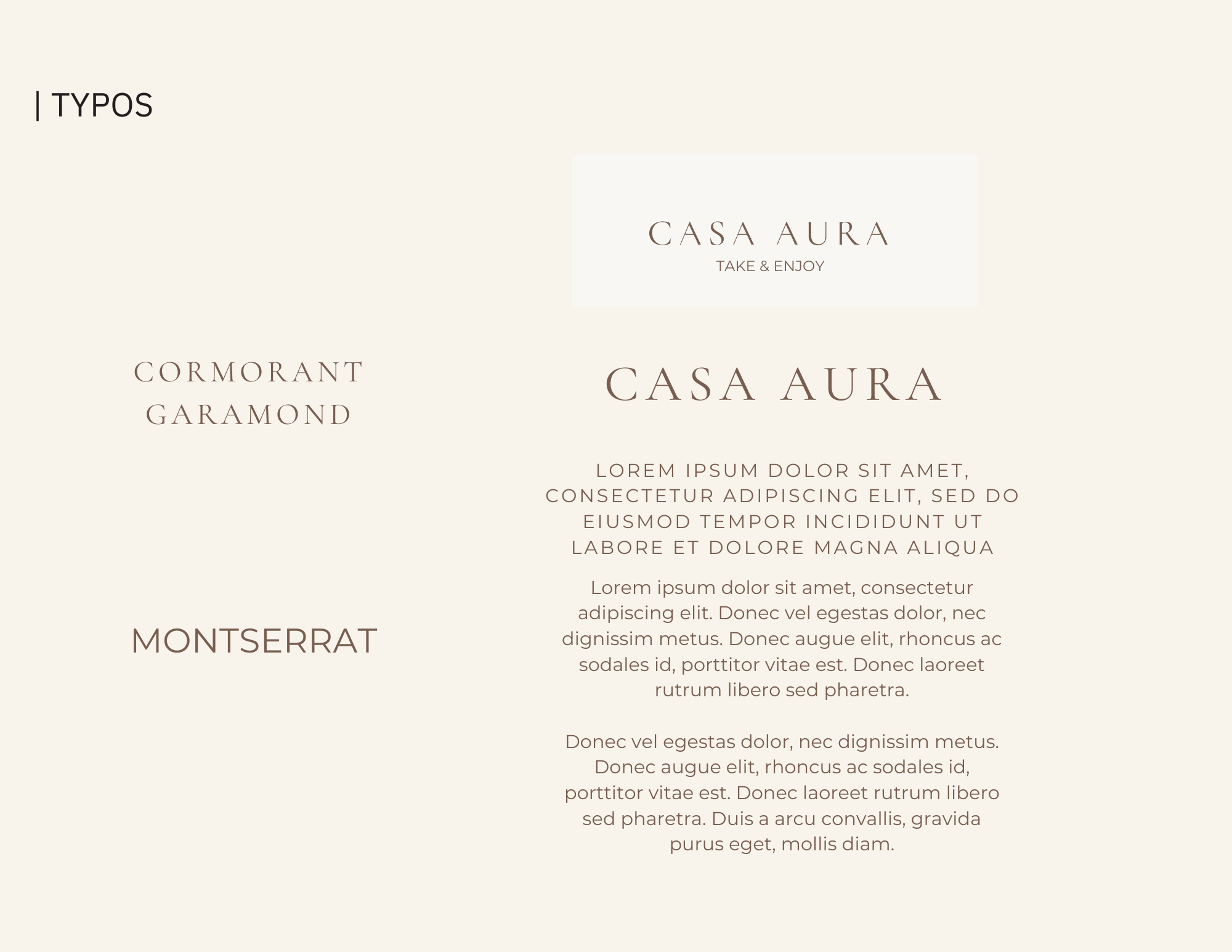 Para la identidad tipográfica de Casa Aura, combiné Cormorant Garamond y Montserrat para lograr un equilibrio entre sofisticación y modernidad. Cormorant aporta elegancia y un aire artístico ideal para el logo y títulos, mientras que Montserrat, con su diseño limpio y contemporáneo, asegura legibilidad en textos secundarios. Juntas, crean una estética refinada y accesible, alineada con la esencia del proyecto.