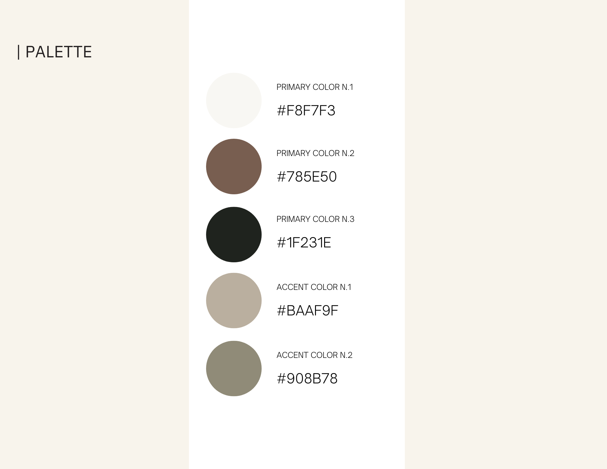 La paleta de colores se inspira en la naturaleza y la arquitectura atemporal, transmitiendo calidez y exclusividad. El blanco roto da luz y minimalismo, el marrón terroso y el negro profundo aportan contraste y solidez, y los acentos en beige y gris verdoso suavizan la composición. Cada tono refuerza la idea de un espacio sereno, sofisticado y bien diseñado.