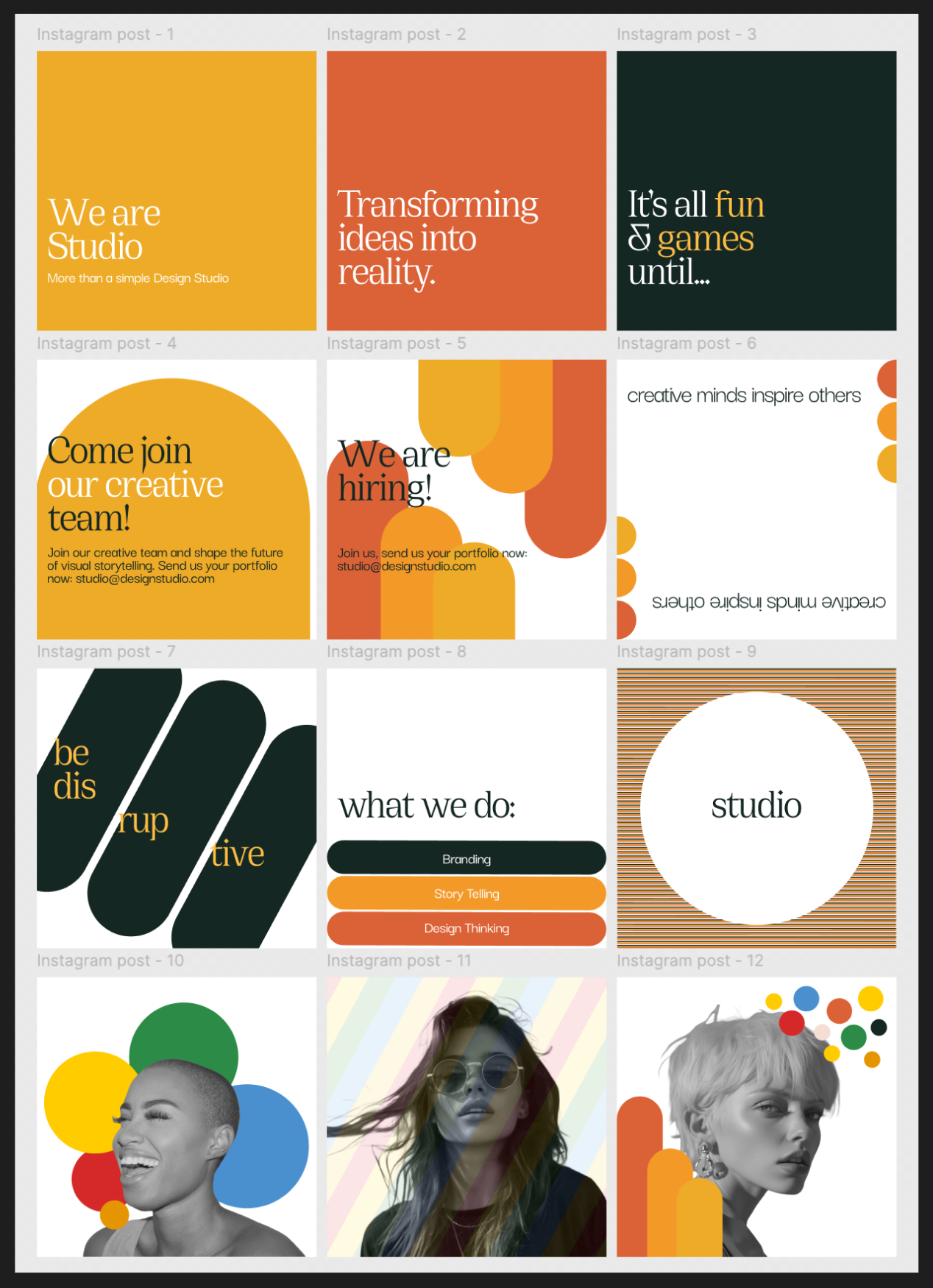 For my very first Domestika course, I worked on a series of social media posts for a design studio, using Figma as the main tool. The project is heavily inspired by Bauhaus but with a modern twist, applying fundamental graphic design principles like geometric shapes & the laws of perception, typography (serif & sans-serif), color theory and color palette selection, the use of grids & composition techniques.