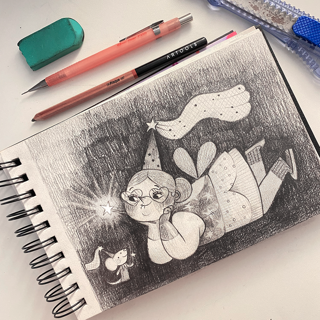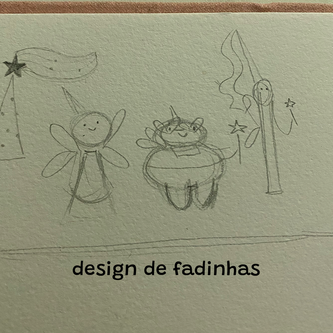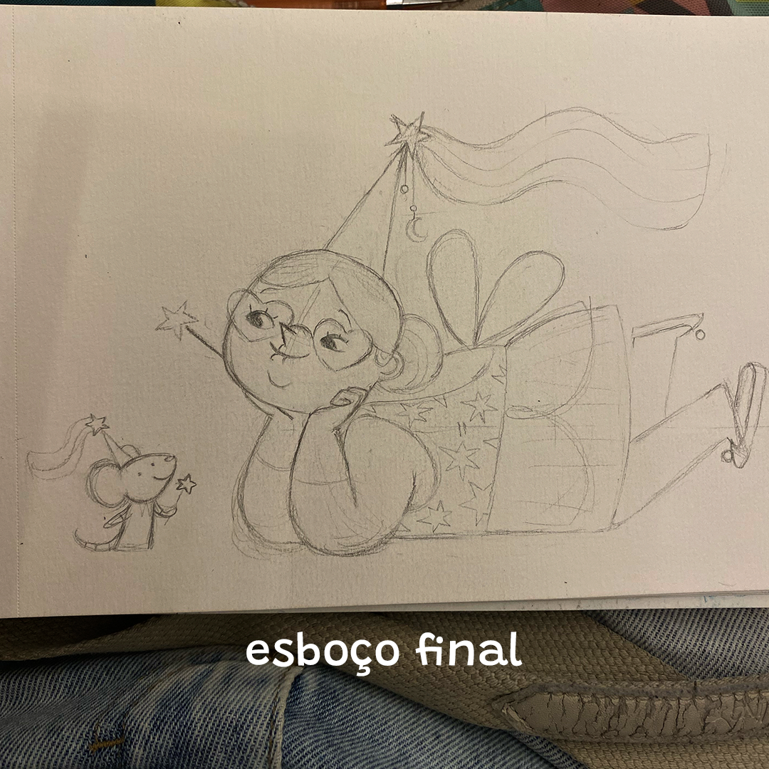 Assim que defini a ideia e o enquadramento, eu redesenhei a fadinha em um papel mais grosso. Fiz isso porque queria pintar ela com lápis grafite, então eu precisava de um papel mais grosso pra textura do grafite aparecer e ficar bem bonita!