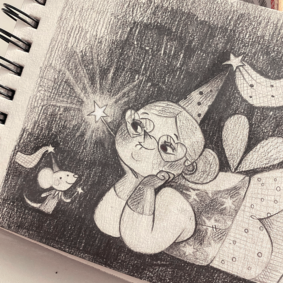 Tamam, bir peri büyükanne çizmek istiyordum ama nasıl olacağına karar vermemiştim, daha uzun ve daha zayıf mı yoksa kısa ve tombul mu? İçgüdülerim bana kısa ve tombul olacağını söyledi, bu yüzden öyle yaptım! Düşünmeyi sevdiğim bir detay da kalp şeklindeki gözlüklerdi!