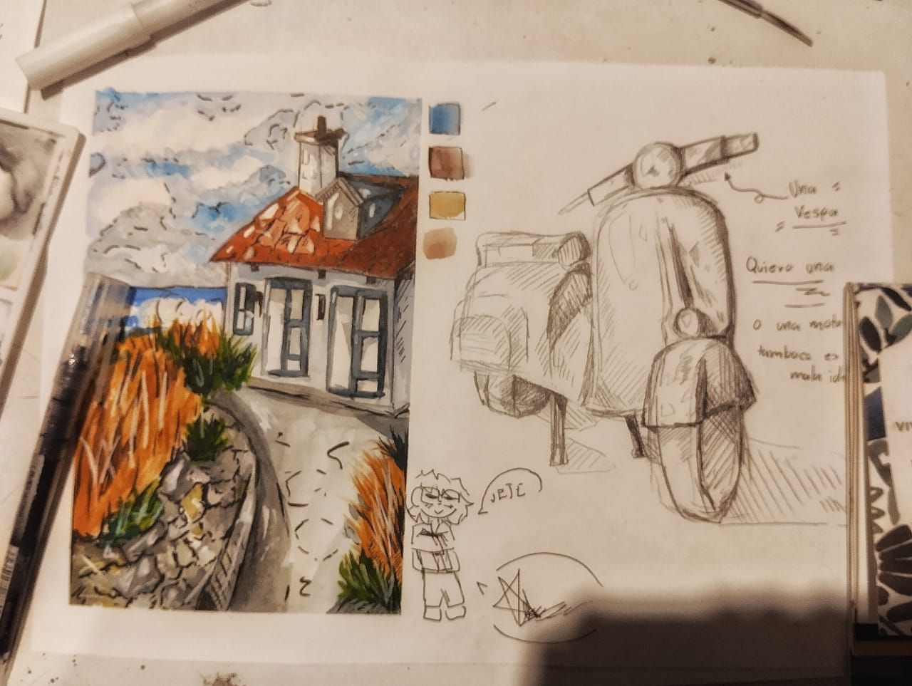 es una ilustración de un paisaje de campo con una vespa al lado