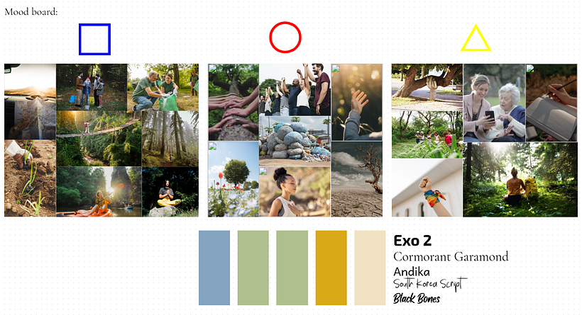 Getting a list of words made easier to get the visual universe of the brand. Here I explored stock photos and this leads me to define the palette colours and typography. I aimed for nature colors but in a smooth way, keeping connection - softness and hope in my message.