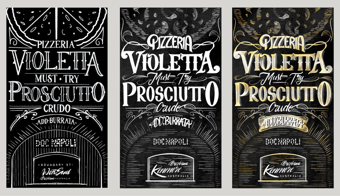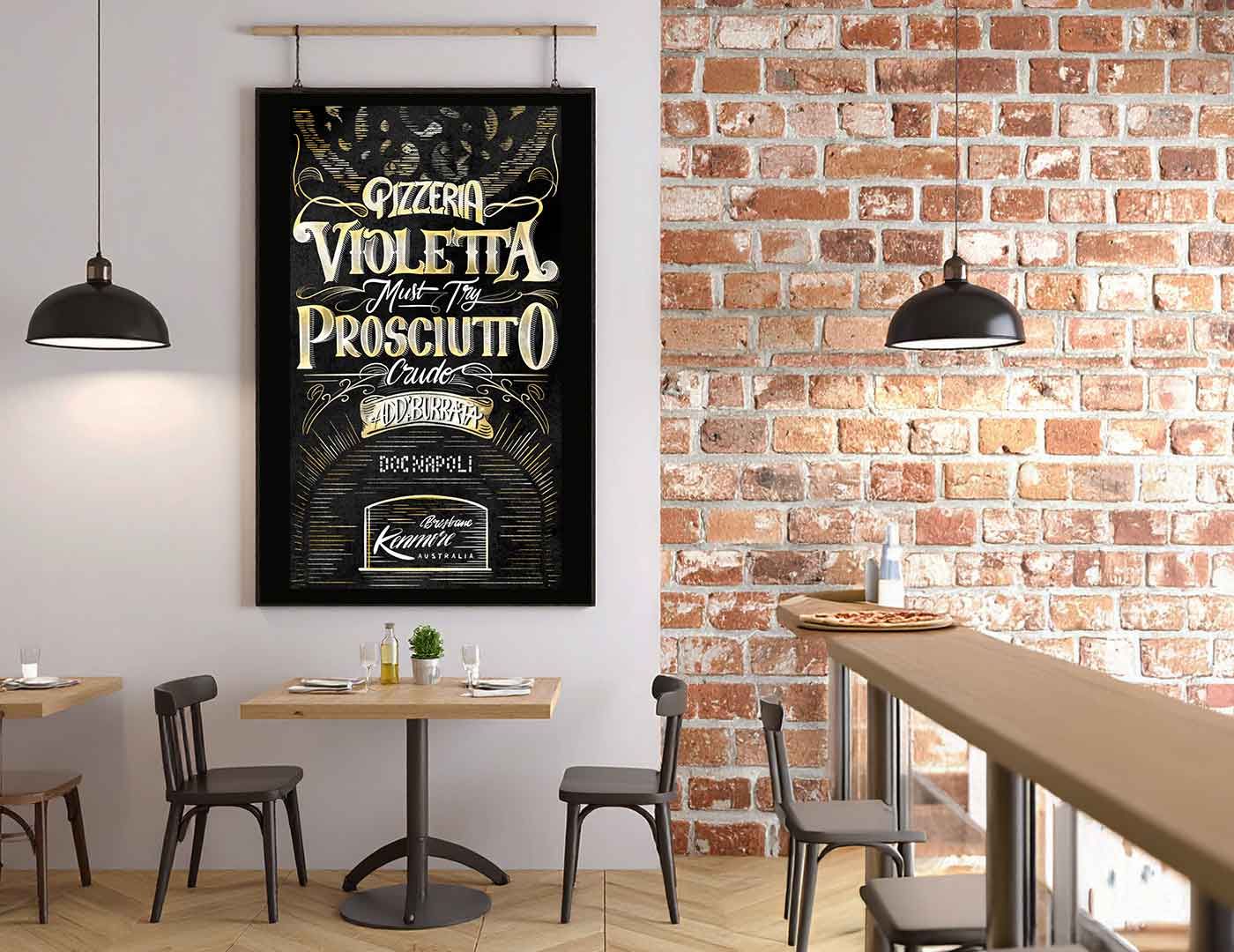 Pizzería Violetta hacía la mejor pizza artesanal en horno de leña que he probado en mi vida. El ambiente era muy tranquilo y relajado, con una estética que evocaba a Europa. Su estilo cromático se basaba en tonos cálidos, especialmente amarillos. La fachada del lugar combinaba blanco y negro, pero lo que más destacaba era su horno: apenas entrabas, lo veías. Por eso, plasmé todos estos conceptos en el póster.