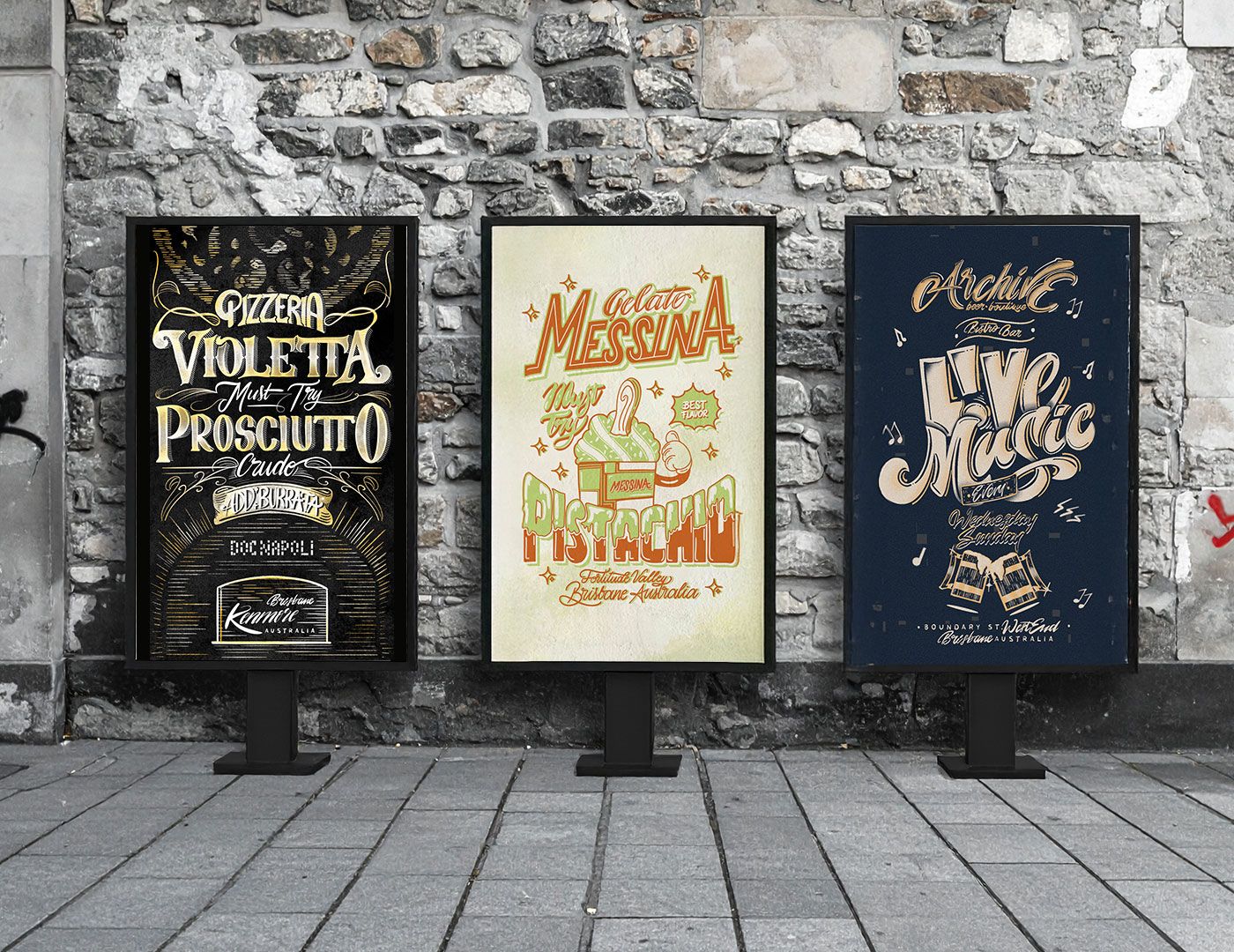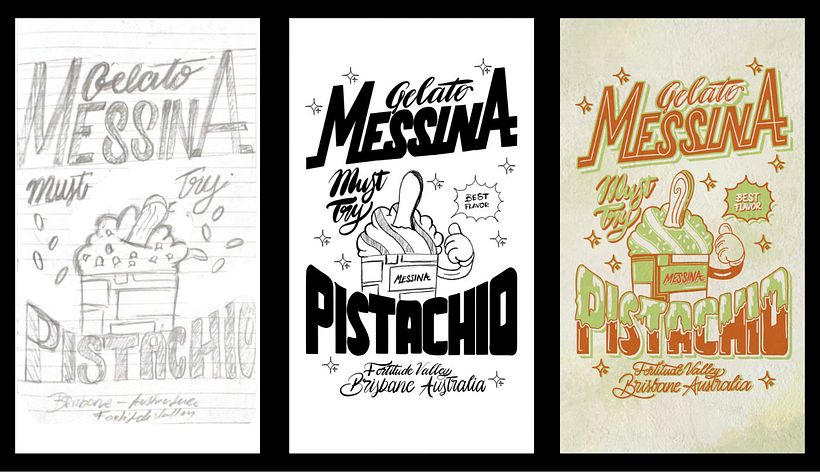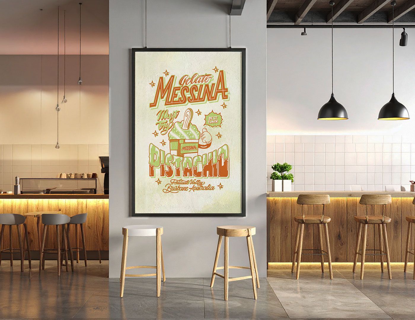 Gelato Messina es un lugar muy chill y relajado, donde siempre ponían música electrónica y el espacio estaba lleno de personalidad. El helado de pistacho era una verdadera magia en el paladar. Decidí transmitir esta experiencia usando su propia paleta de colores y diseñando un personaje (el helado) que complementara el póster y conectara con la esencia de la marca.