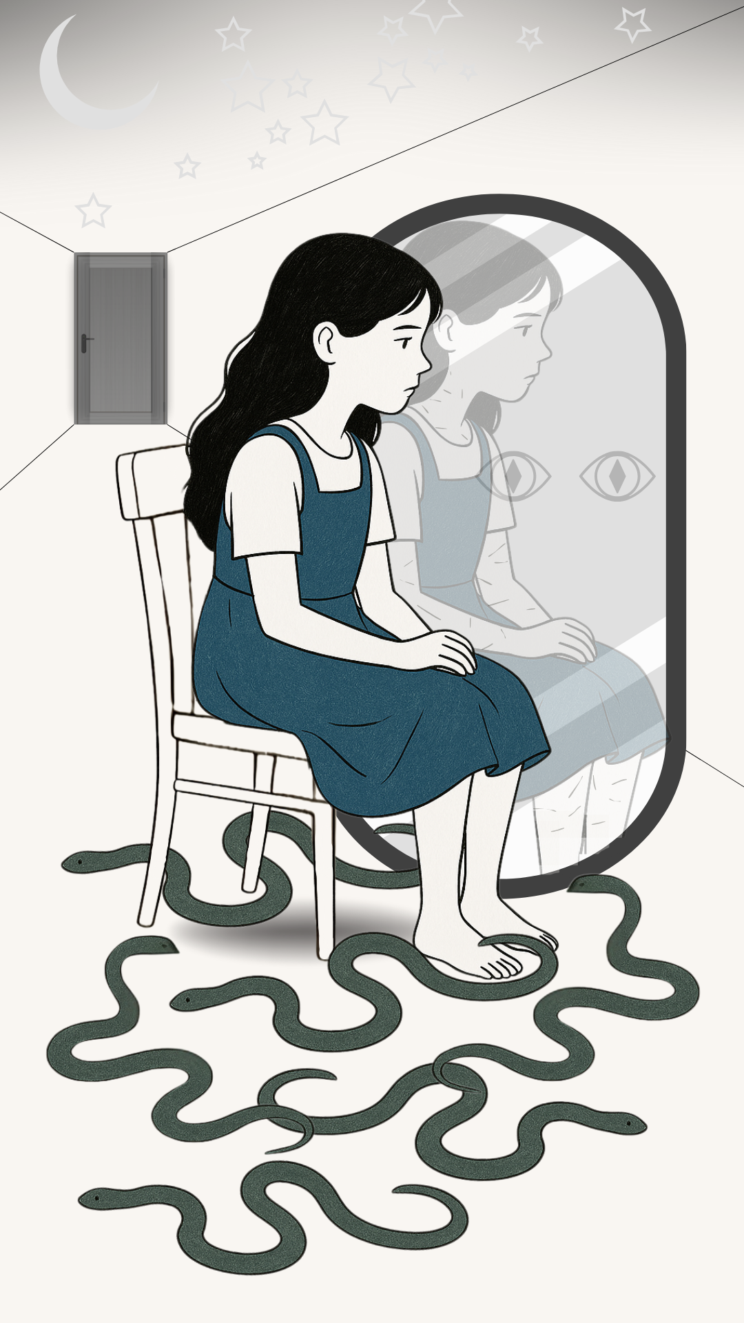 "Me gustaría ver una versión de una niña sentada en una silla mirando a la nada con serpientes en el piso. Que el fondo sea blanco, y que la niña tenga una camisa blanca y un vestido azul con tirantes arriba que le lleguen solo a las rodillas (un vestido tipo Alicia en el país de las maravillas - el dibujo) La niña tiene que tener el pelo color negro - largo medio ondulado. El vestido (azul) con tirantes, las serpientes (verdes - grises) y el pelo (negro) se destaque por el color, lo demas que quede como balnco y negro"
