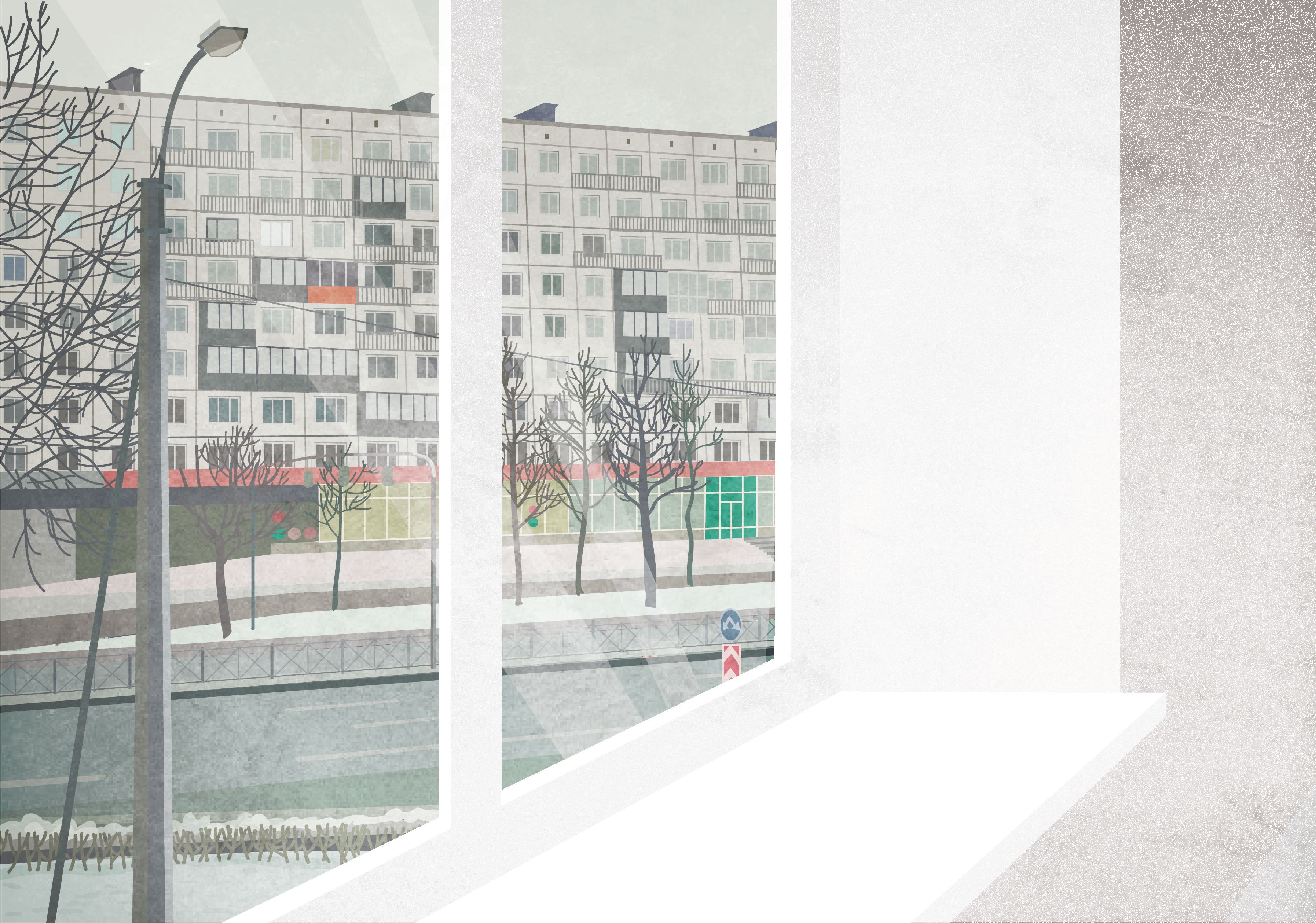 This place is unremarkable, except that I used to live here. But such places are the most important, aren't they? How nice it is to find the place where you live on any map. This illustration also captures a moment that has already been lost. During the renovation of the facade, the house opposite was bright white for a while. Now it is painted a piglet-beige color.