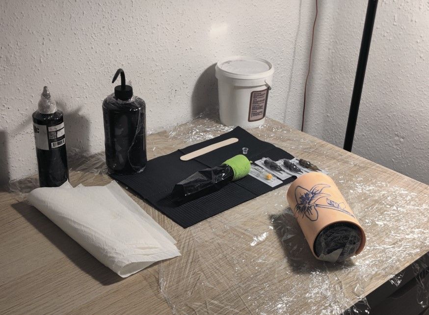 He preparado las agujas necesarias, envuelto la máquina, preparado papel, vaselina, tinta y agua con jabón.