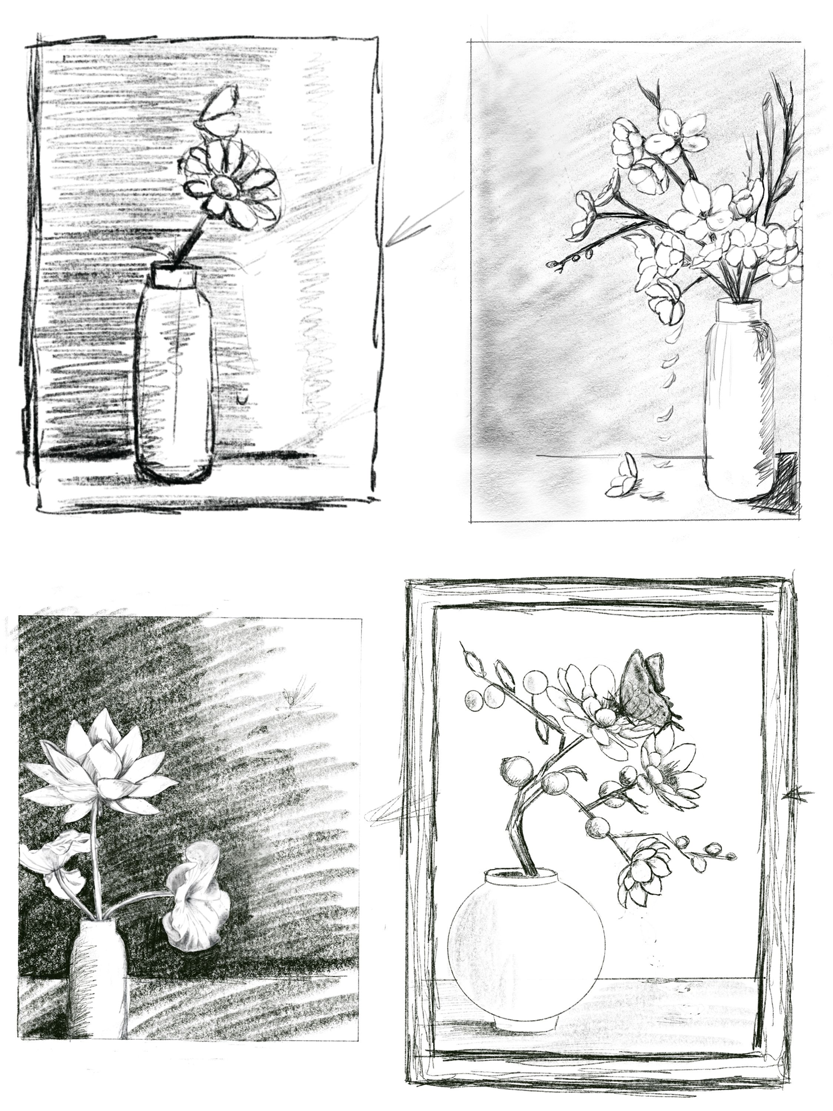 From the mood board, I created four pencil sketches in Procreate using various still life arrangements, flower types, and possibilities for movement. After much deliberation, I chose the arrangement withe the crab apples in the round vase with the butterfly as the movement option.