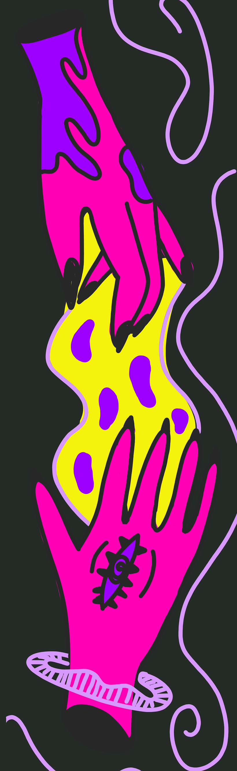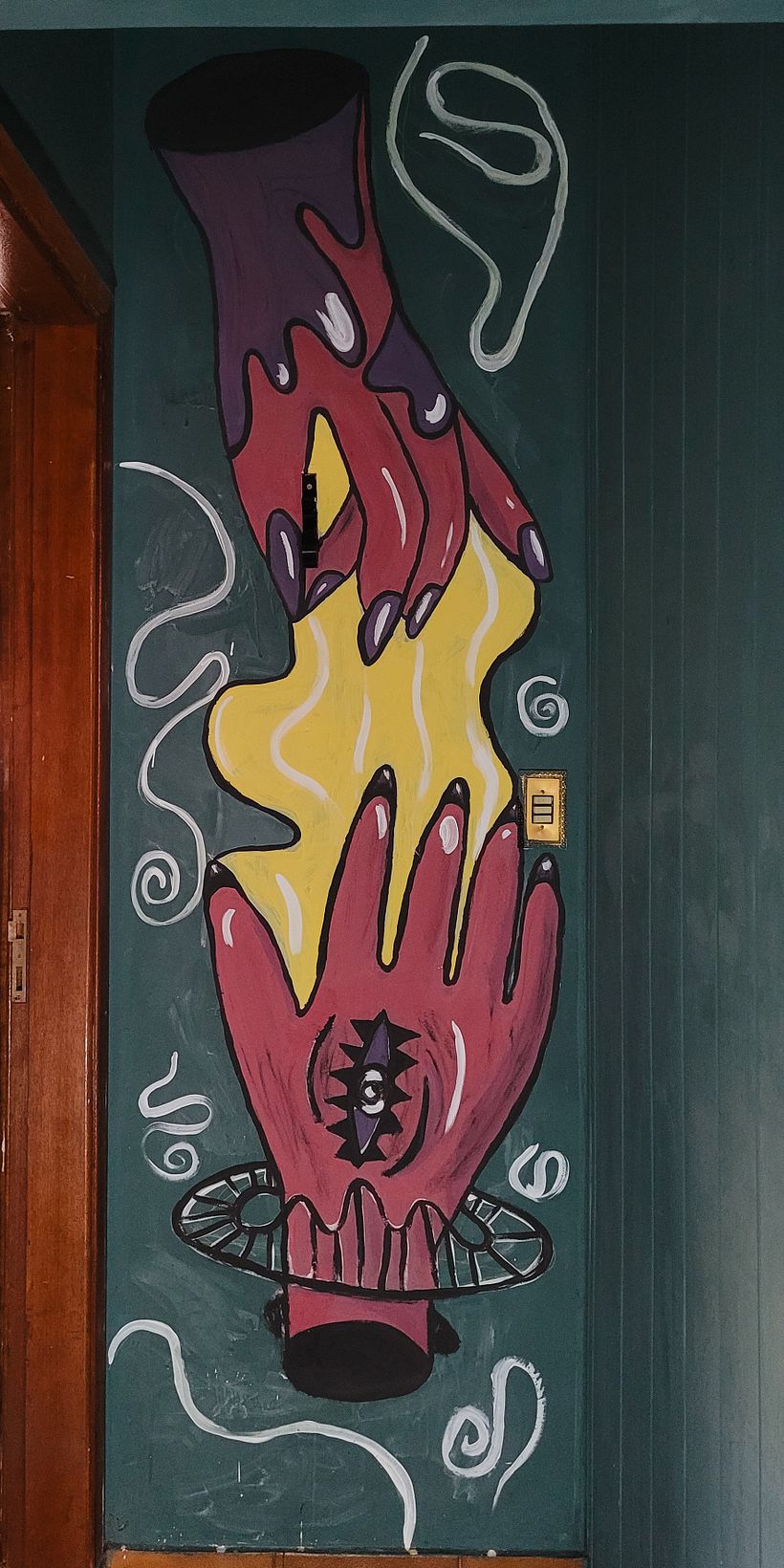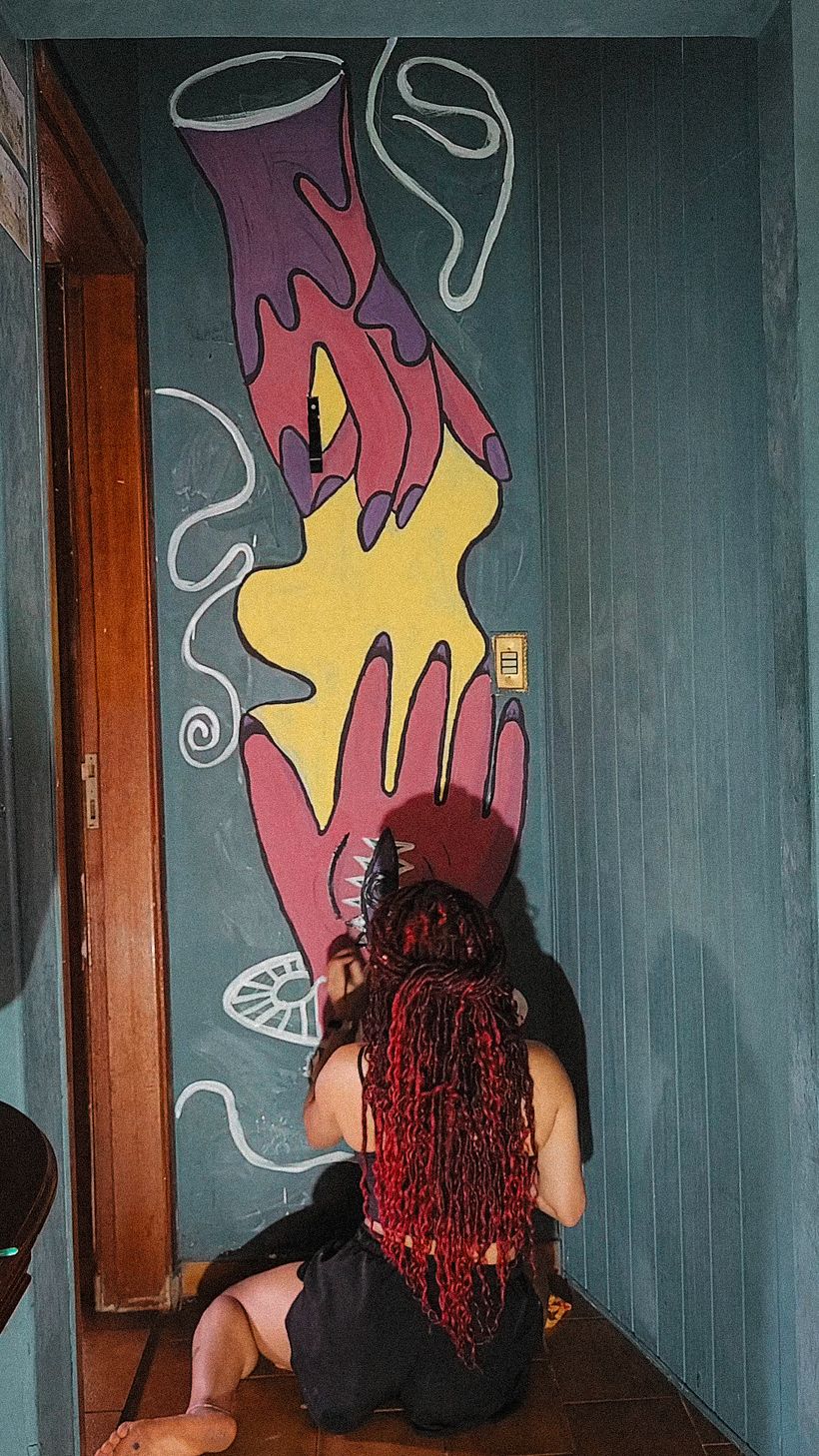 Usei as cores que mais gosto e explorei um estilo mais psicodélico, que me representa muito. Hoje, olho para essa parede que antes estava sem vida e fico feliz em saber que consegui dar mais personalidade a ela.