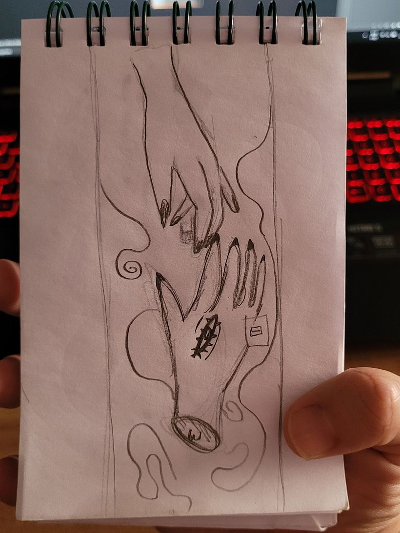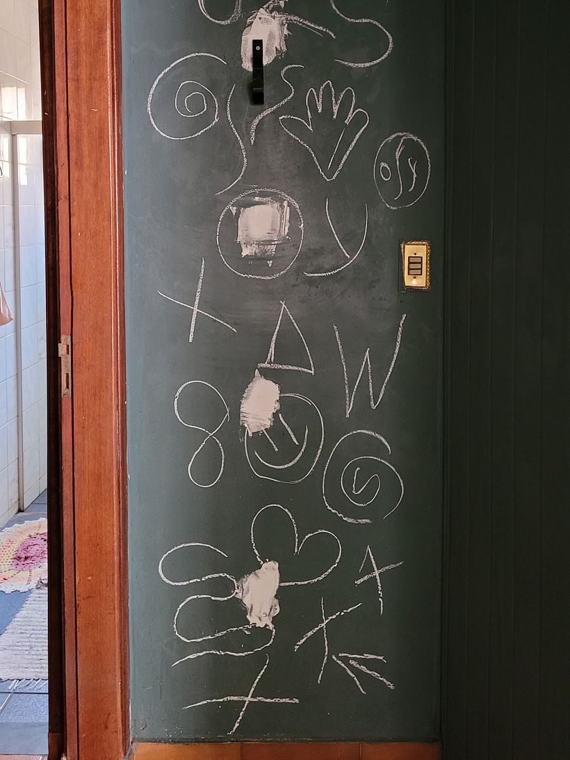Comecei tirando as medidas da parede e, em seguida, fiz um esboço no papel com a ideia que tinha em mente. Depois, digitalizei o desenho no Photoshop, fotografei a parede com os grafismos e encaixei o desenho nela para visualizar o resultado antes de começar (quem quiser ver o processo completo, está no meu Instagram: [https://www.instagram.com/p/DPj8pcbkQr8/]).