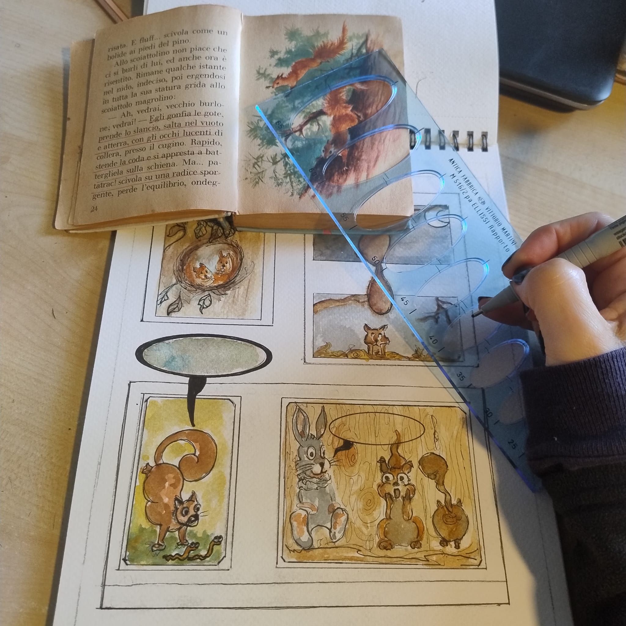 Inizialmente sono andata a evidenziare le parti del testo su cui avrei voluto lavorare. Una volta individuate e sottolineate ho proseguito impaginando una prima bozza di impaginazione e, sopratutto capire con quali tipi di illustrazioni avrei potuto realizzare meglio quello che ritenevo essere il climax e l'atmosfera generale. Quindi sono passata al foglio più grande per iniziare la composizione della tavola.