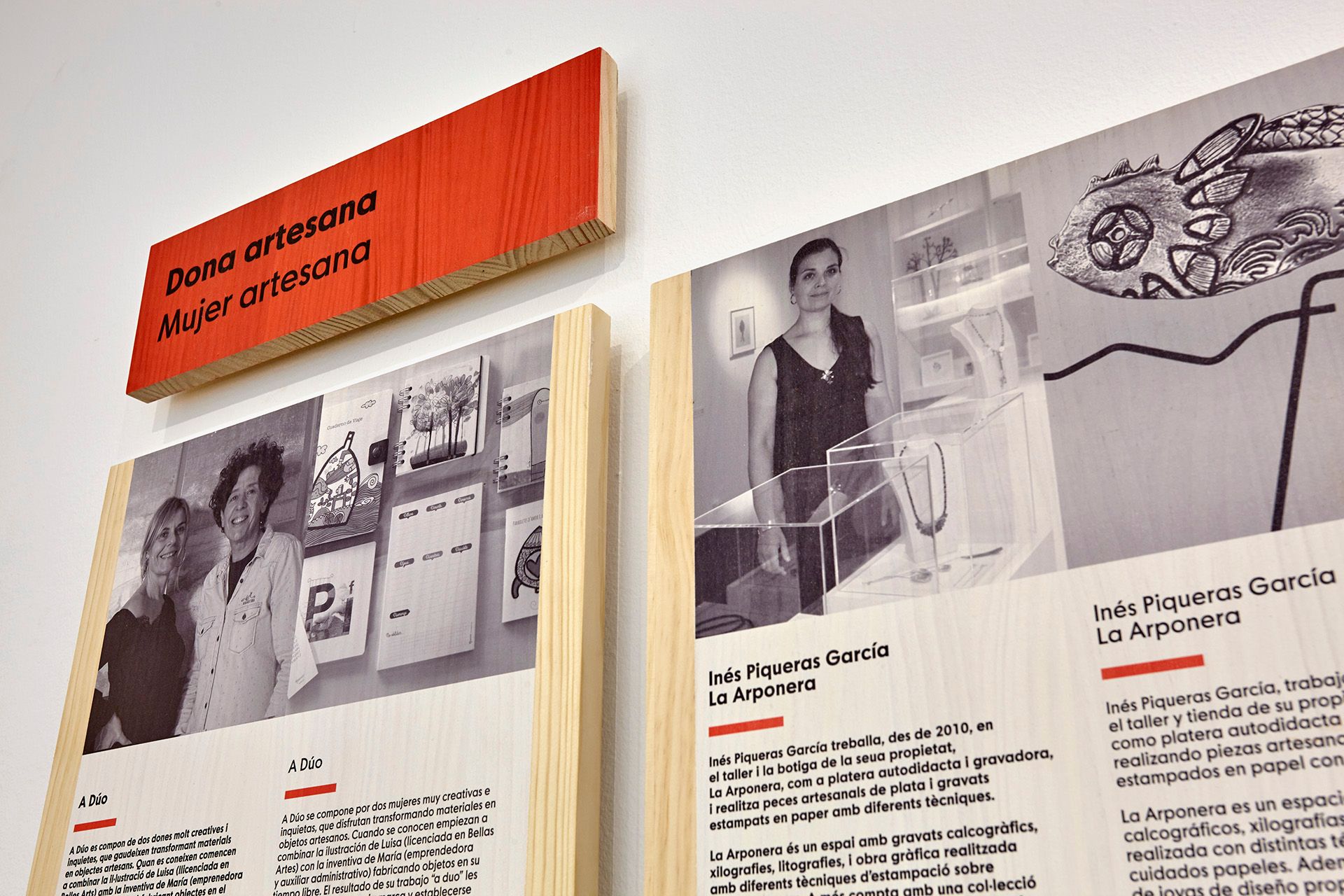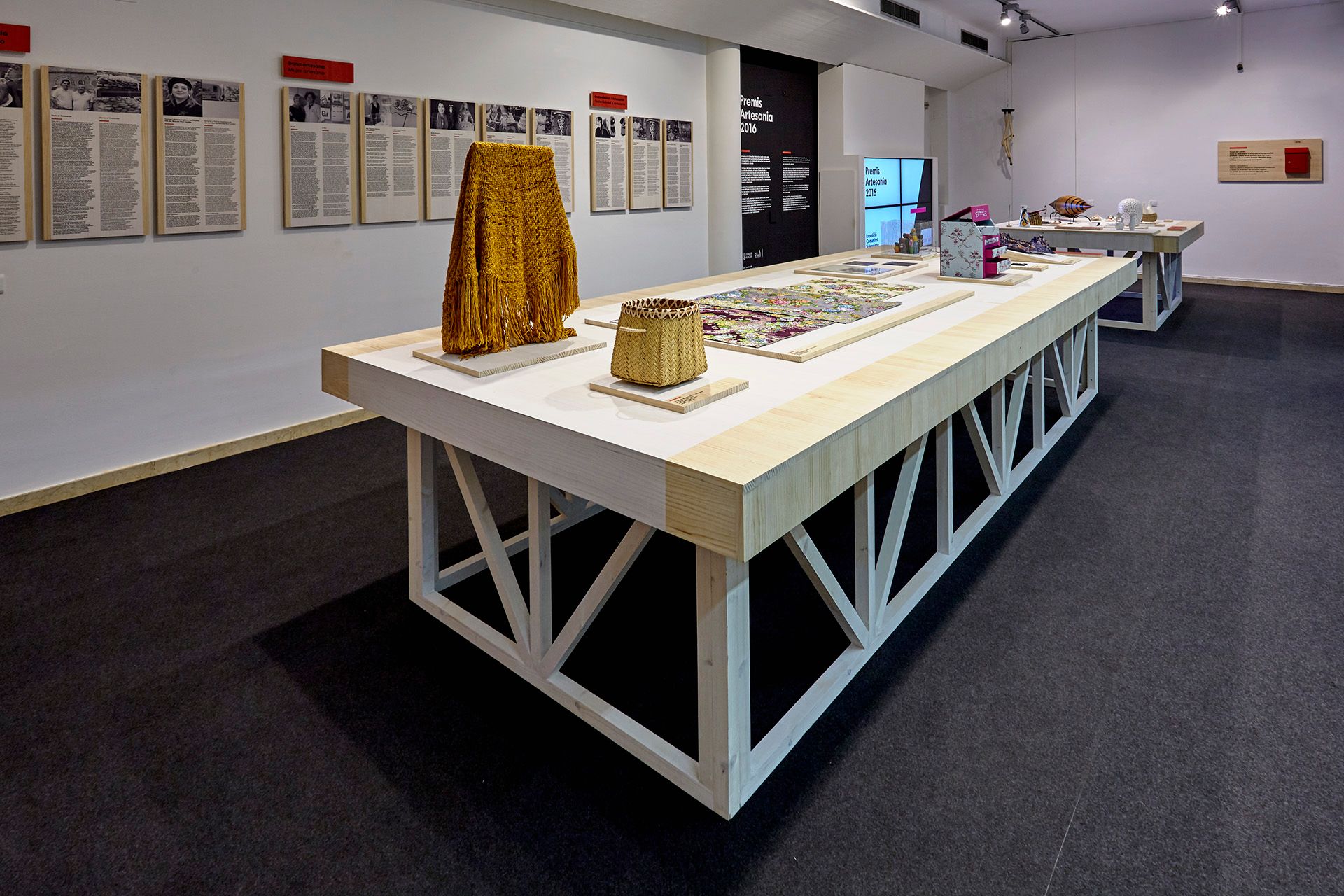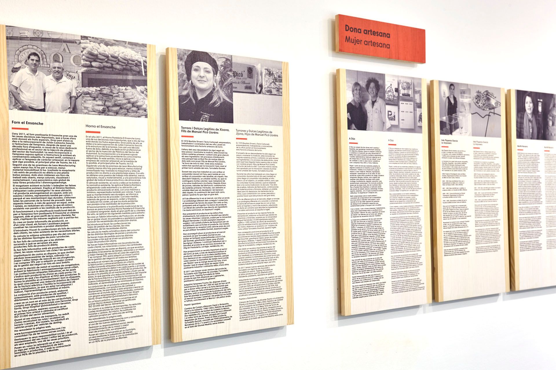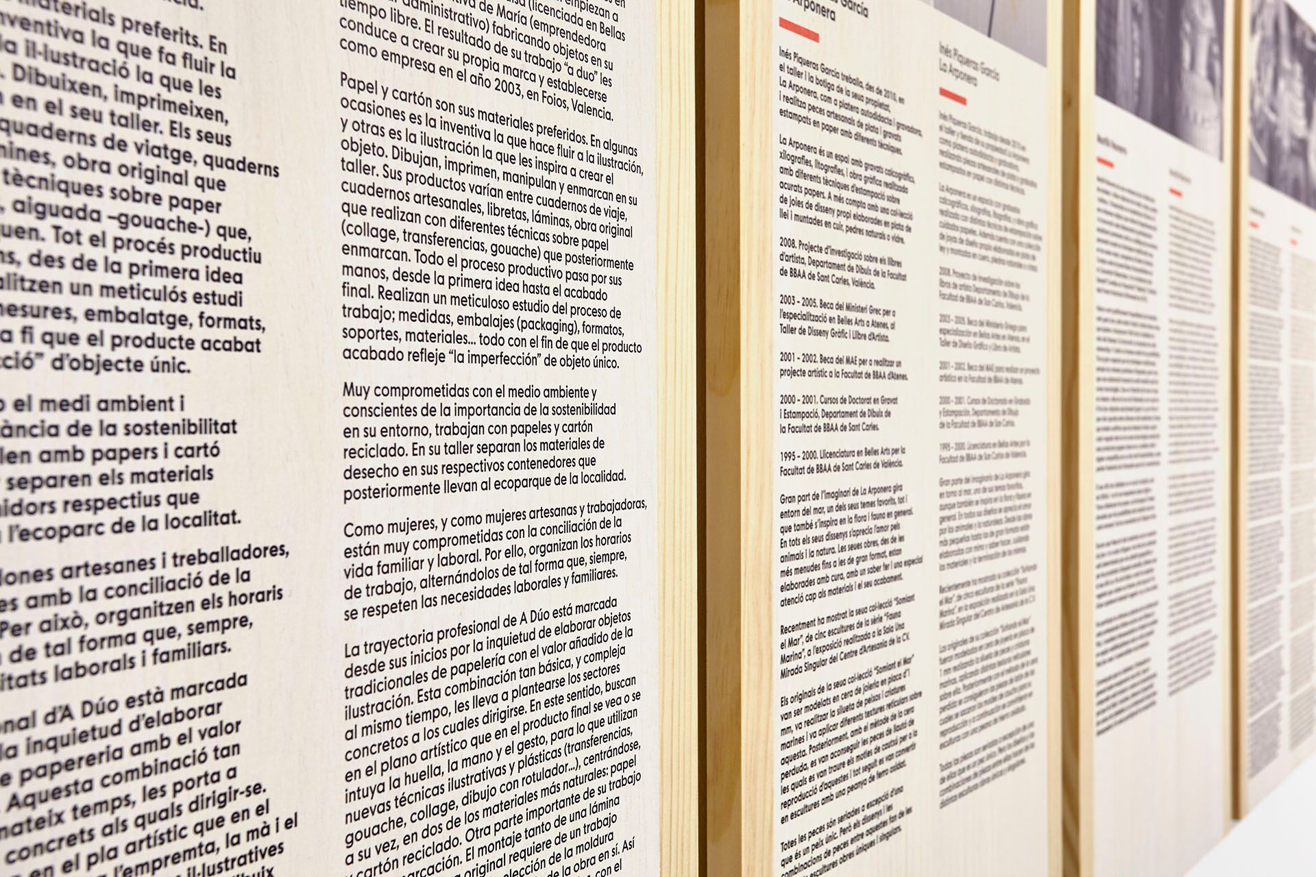 Todos los elementos expositivos, desde las mesas expositoras hasta los paneles y cartelas informativas, están realizados en madera de pino teñido e impresas de forma directa sobre el material para conseguir la uniformidad y relación con la gráfica planteada para la exposición.