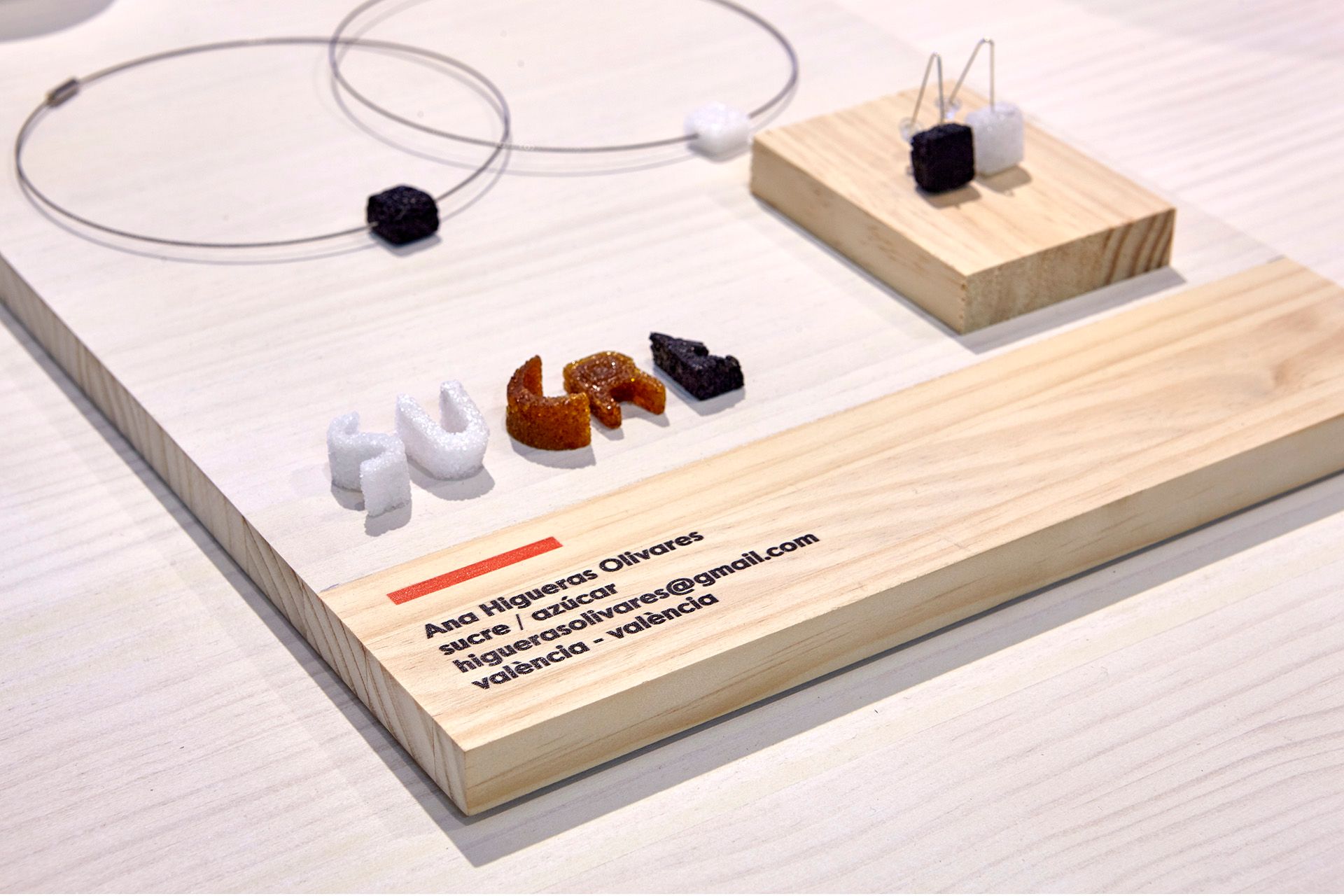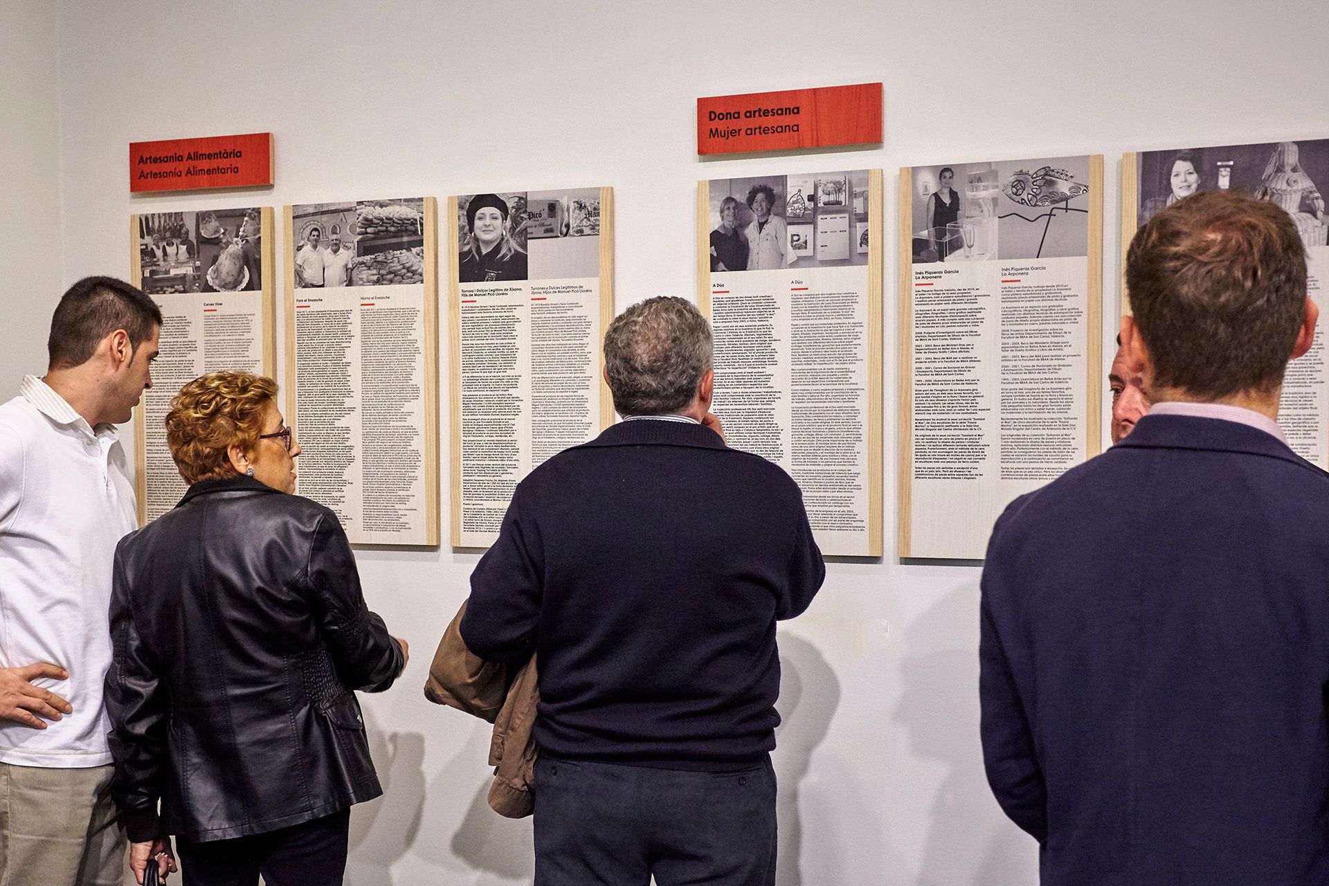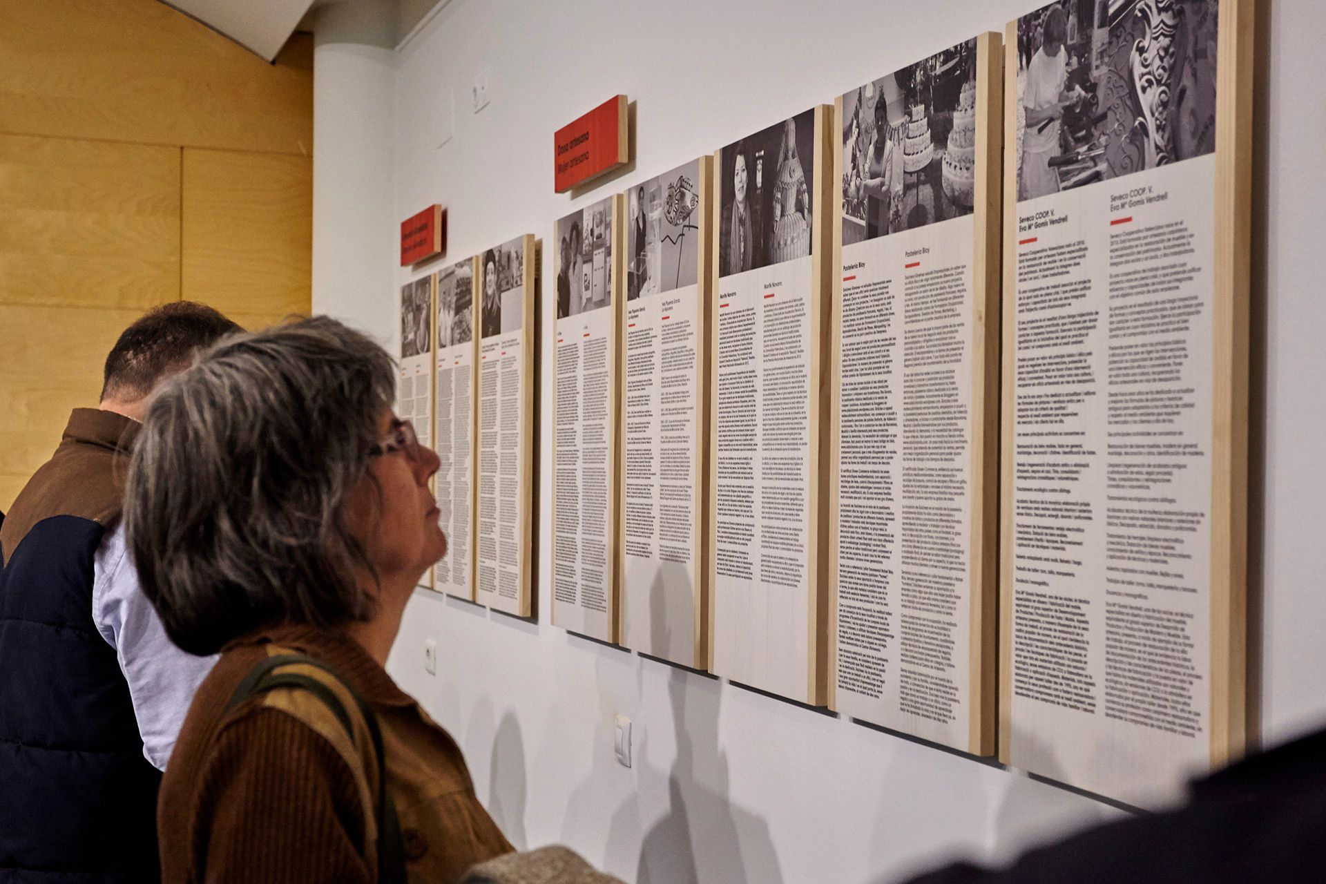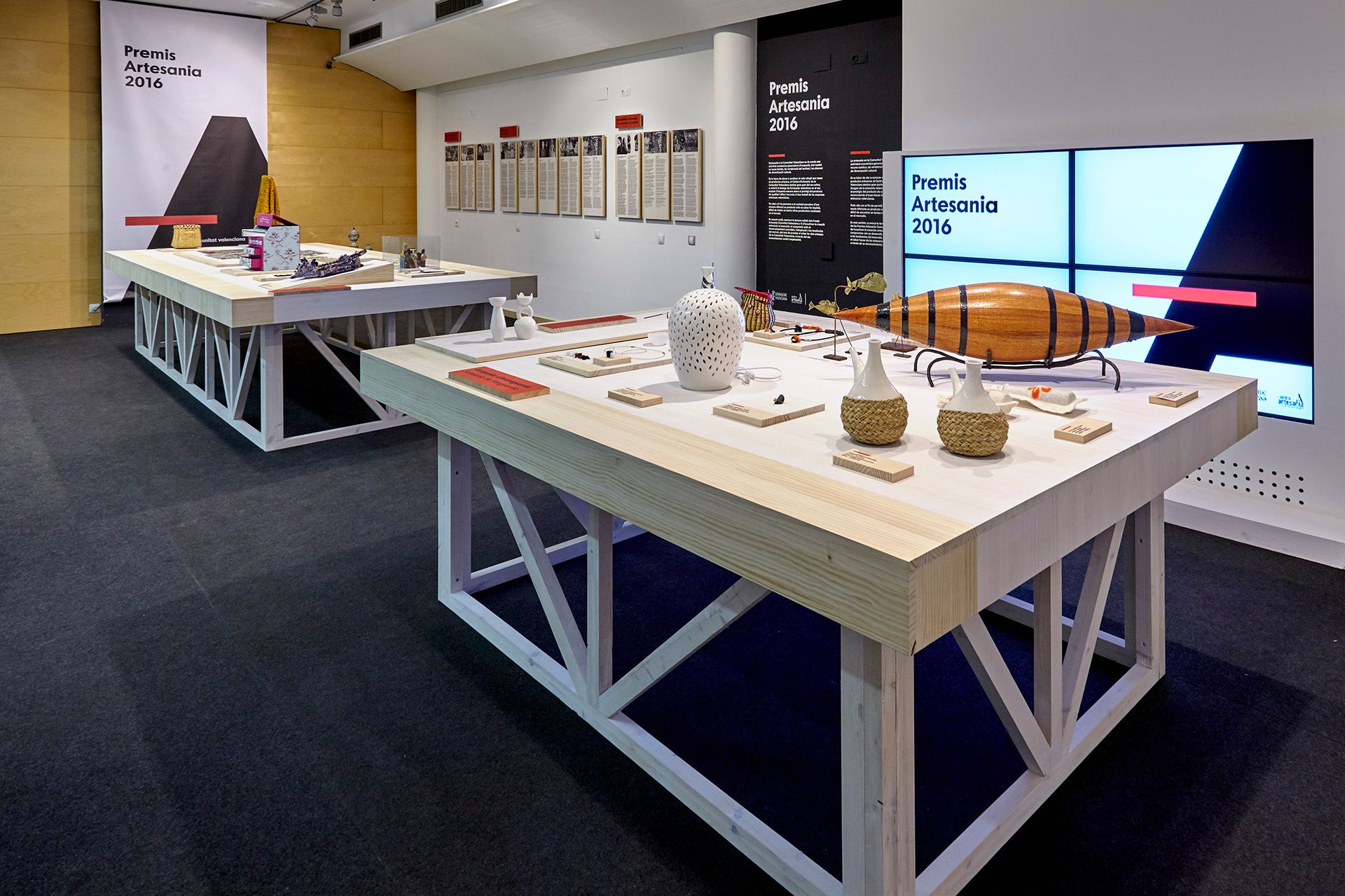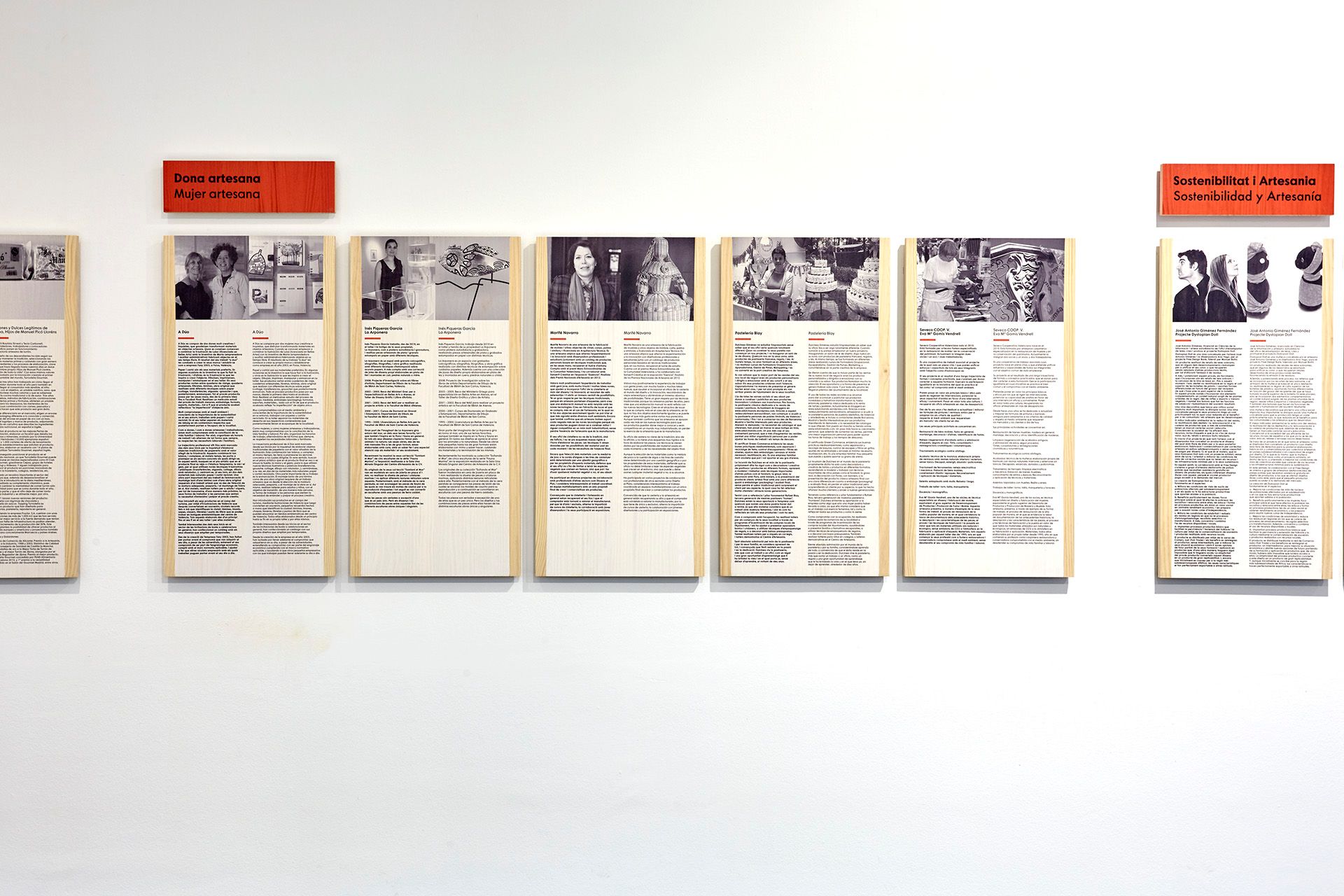 Todos los elementos expositivos, desde las mesas expositoras hasta los paneles y cartelas informativas, están realizados en madera de pino teñido e impresas de forma directa sobre el material para conseguir la uniformidad y relación con la gráfica planteada para la exposición.