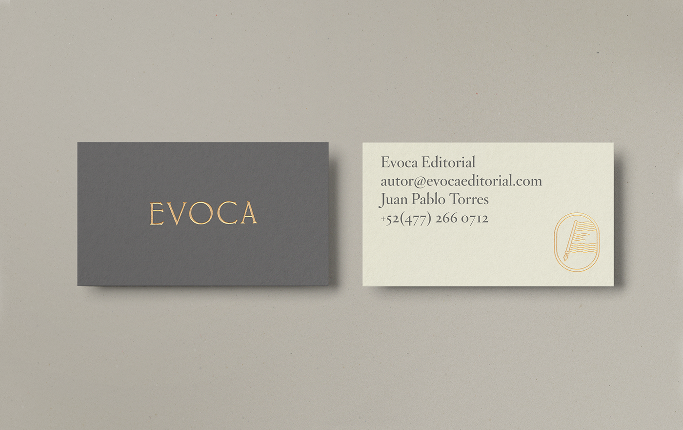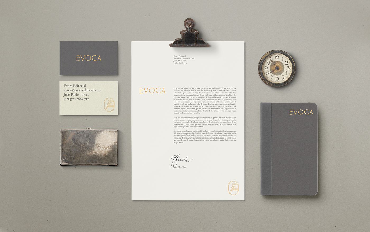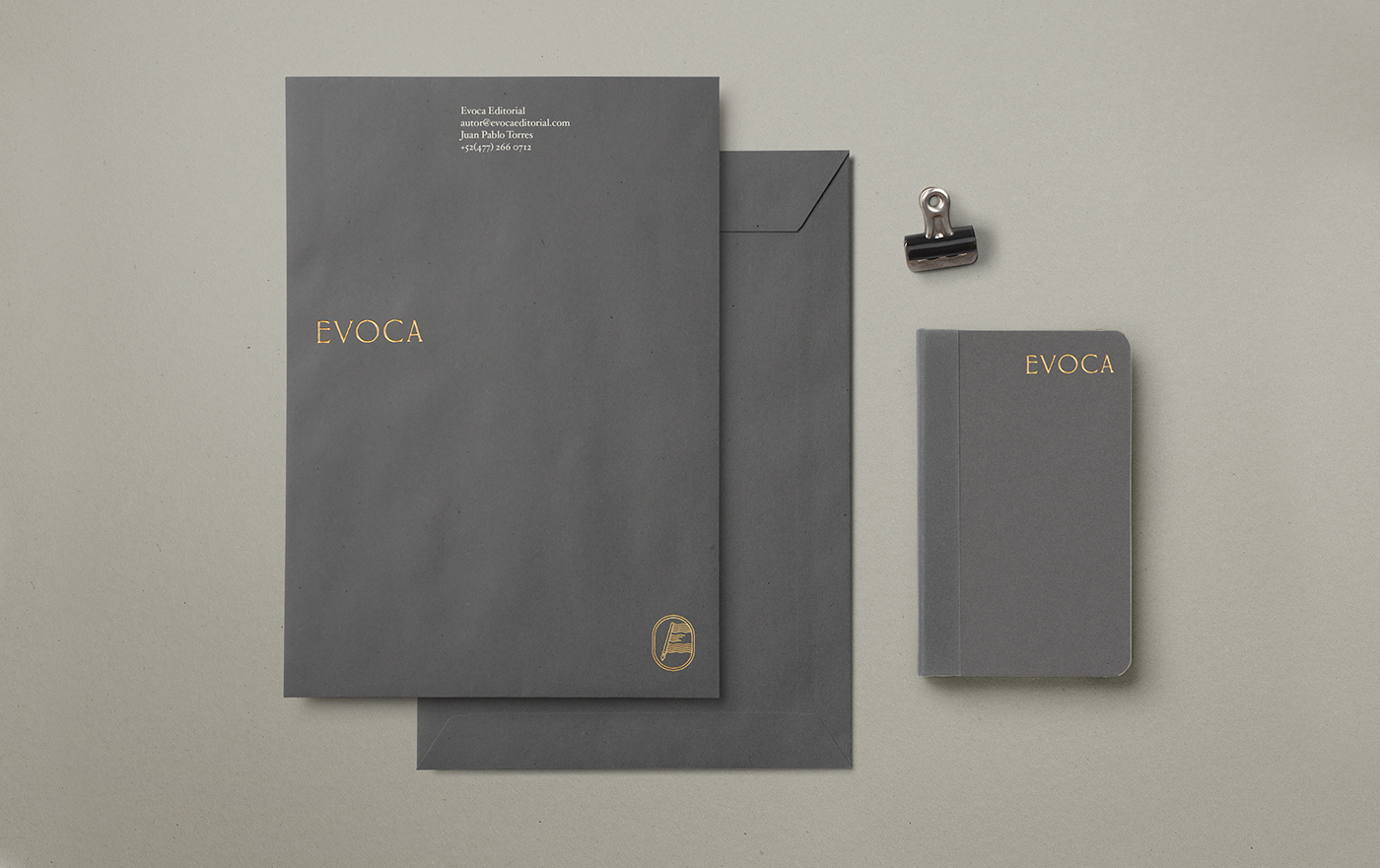 Evoca es una editorial dedicada a escribir las historias de vida de las personas, transformando estas memorias en obras literarias para que sean recordadas por siempre. El diseño debía reflejar el producto valioso y memorable que es, por esta razón se utilizó un color dorado para simular el tesoro que cada edición guarda dentro de sus páginas. También se procuró un diseño clásico y a la vez contemporáneo cuidando la elegancia y calidad de su imagen.