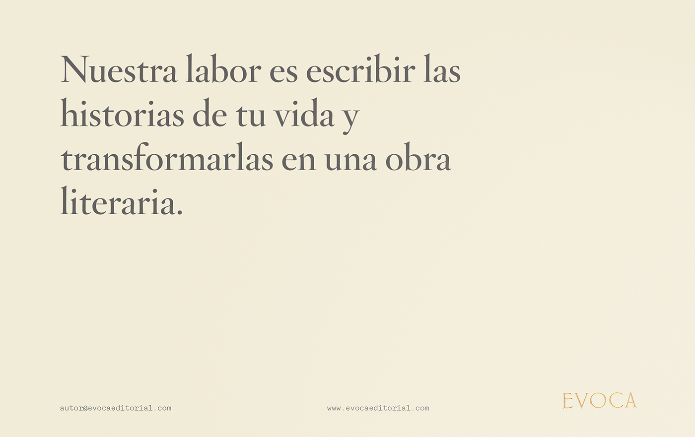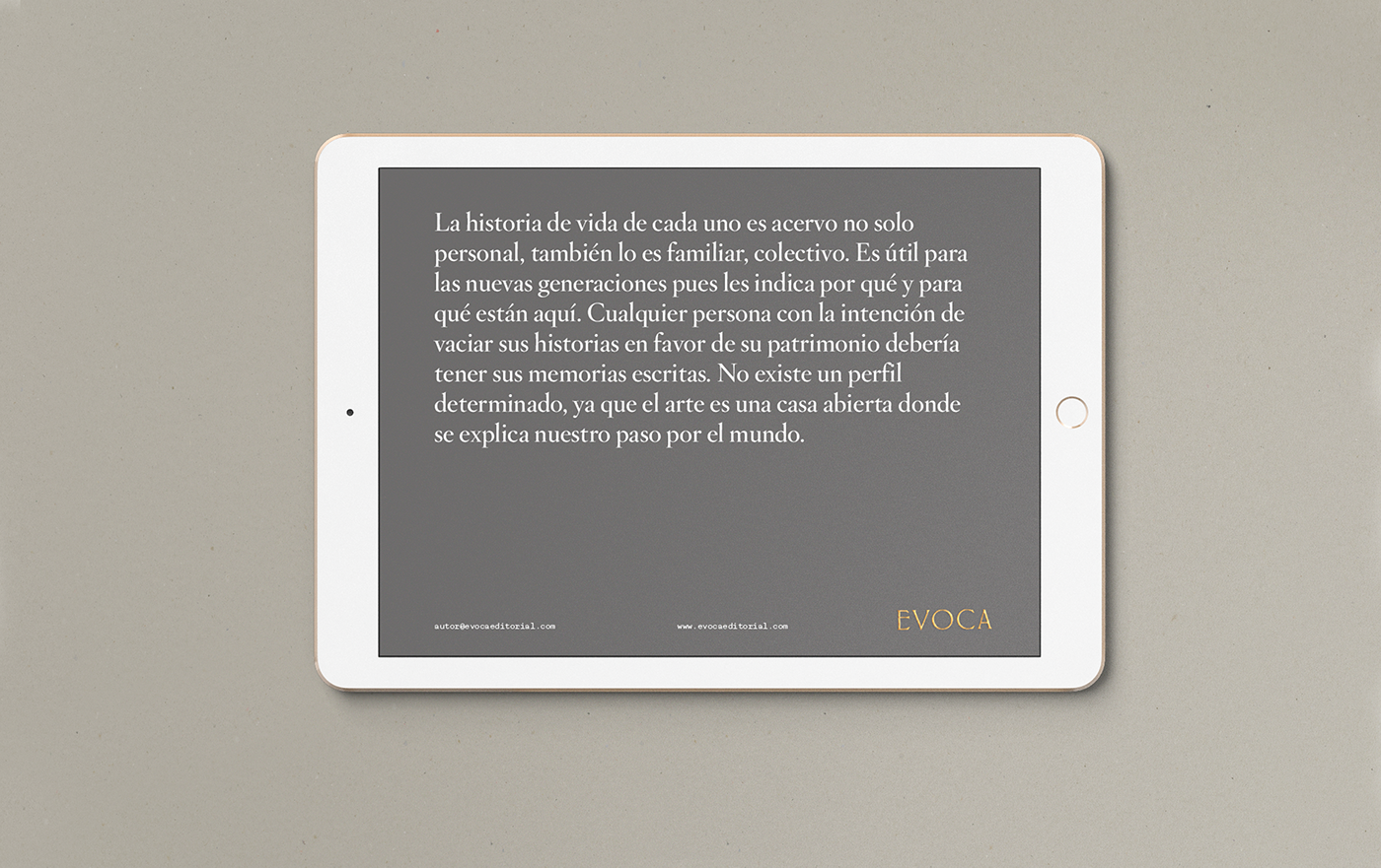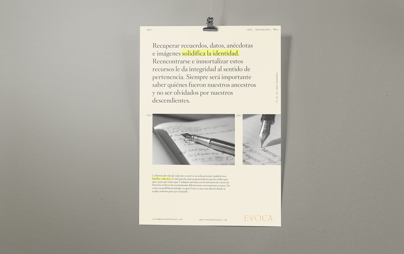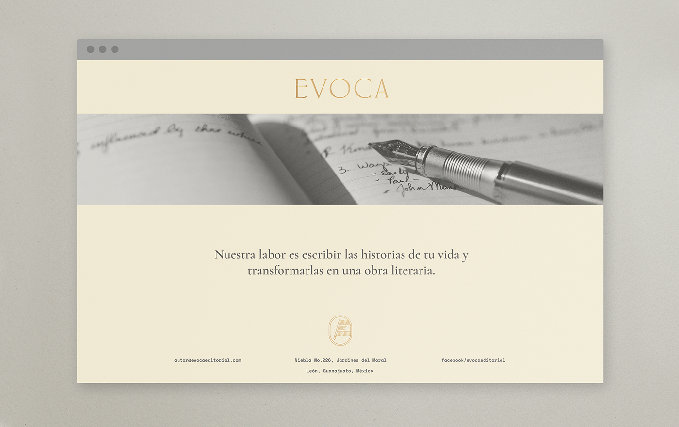Evoca es una editorial dedicada a escribir las historias de vida de las personas, transformando estas memorias en obras literarias para que sean recordadas por siempre. El diseño debía reflejar el producto valioso y memorable que es, por esta razón se utilizó un color dorado para simular el tesoro que cada edición guarda dentro de sus páginas. También se procuró un diseño clásico y a la vez contemporáneo cuidando la elegancia y calidad de su imagen.