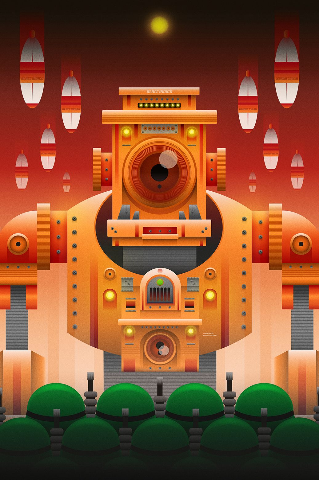 What a raffled project. It has reminded me of those eighties robots that had their pistol in one of their arms; you have a good color palette and your composition very polished.