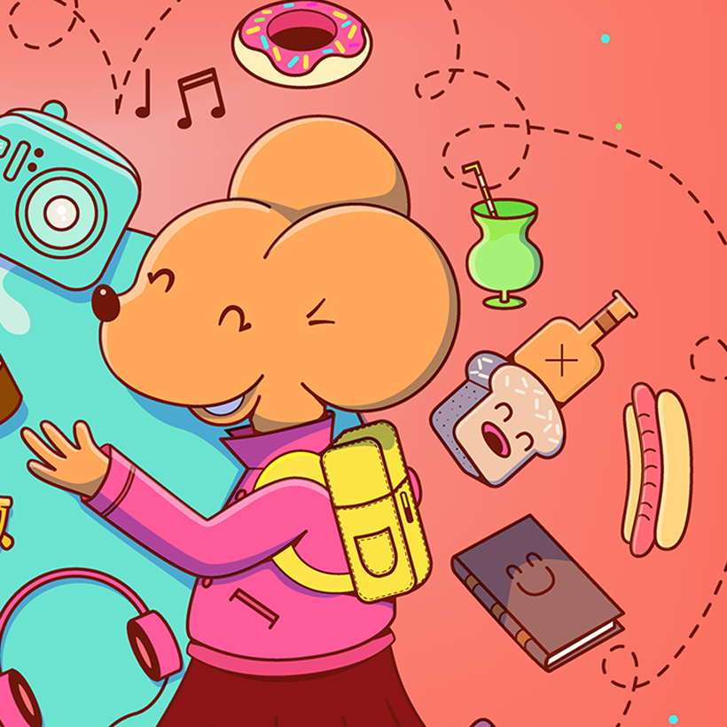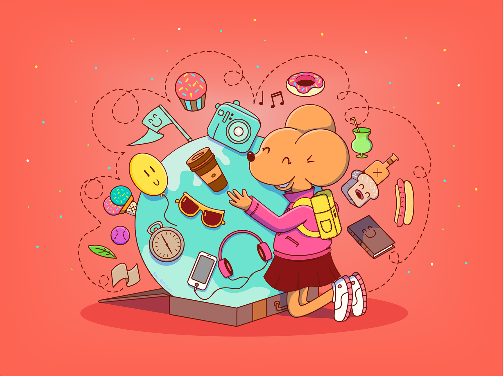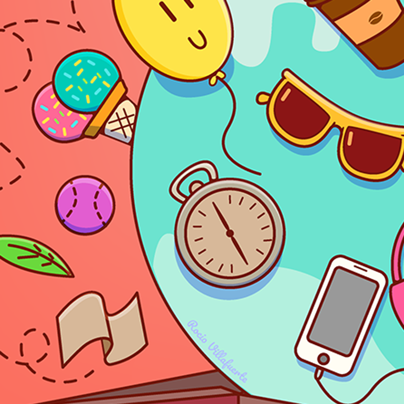 Para este proyecto tome como idea las experiencias de los viajes. La ilustración muestra elementos característicos que suelen presentarse como recuerdos en los viajes que uno puede realizar. Como ilustradora, traté de jugar con la imaginación en la representación del placer que da viajar.
