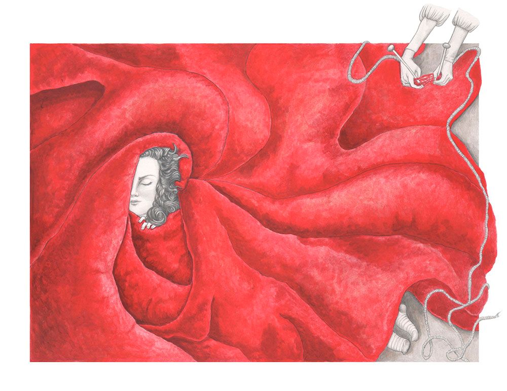 Great illustration! I like the red hood that is being knitted. You just want to reach into it :).