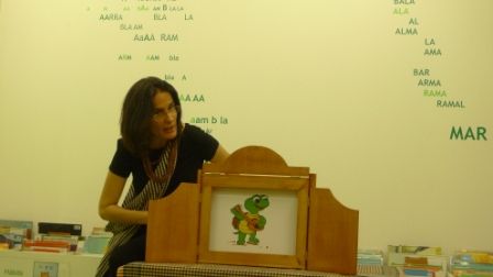 Sé que en el curso se propone hacer tres ilustraciones pero me he decidido a publicar todo el cuento para que se aprecie mejor en su conjunto. También he incluido una imagen de la narradora utilizando el kamishibai para que veais exactamente de qué se trata.