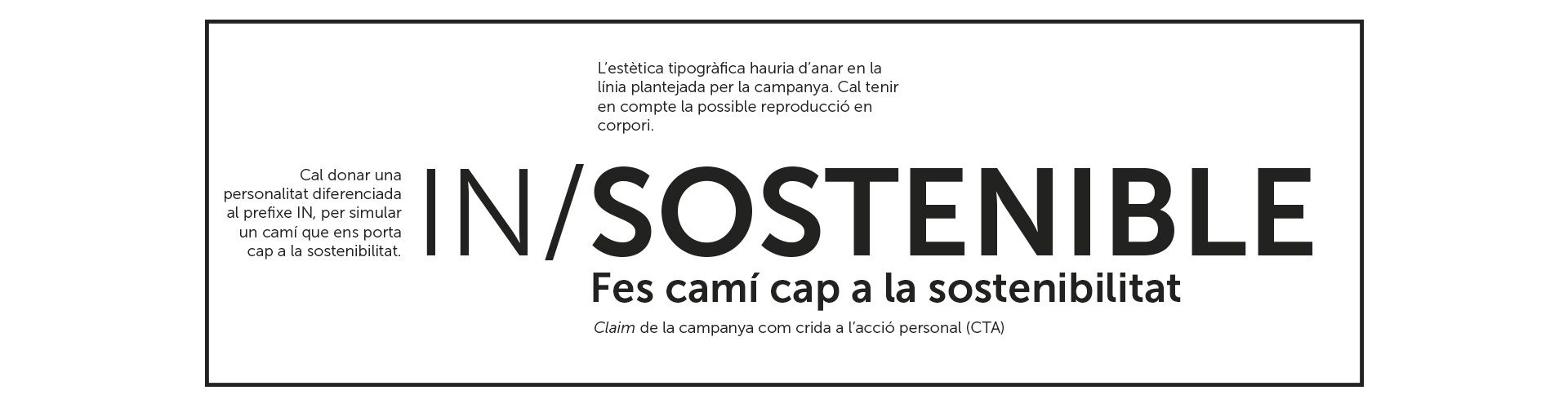 Apostamos por una tipografía clara y de fácil lectura para el logotipo de la campaña. Atemporal y que nos deja añadir elementos gráficos más recargados con texturas o colores que lo complementen. Se hace hincapié en el (IN)SOSTENIBLE tachando el prefijo a través de un trazo manuscrito que simula a la vez un camino y que nos deja clara cual es la vía a seguir hacia la sostenibilidad.