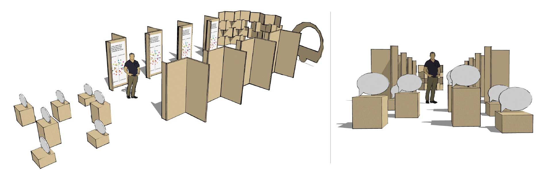 El material principal propuesto para el diseño de la exposición es el cartón. Este material totalmente reciclable y reutilizable encaja perfectamente con el concepto sostenible presentado.
