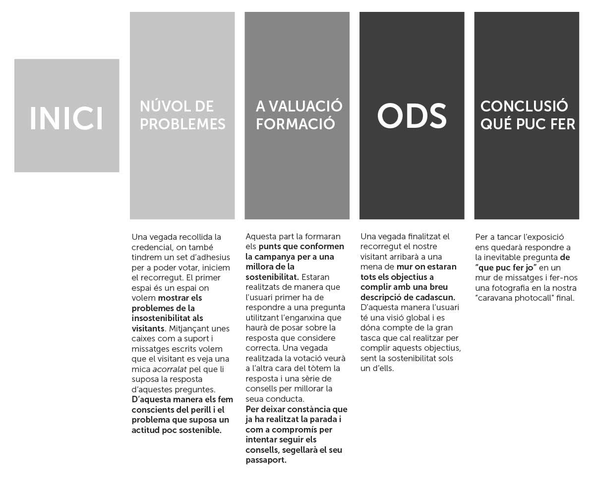 La exposición es el centro neurálgico de la campaña. Será aquí donde cada visitante experimentará su viaje hacia la sostenibilidad. Para comenzar el viaje tendrá que recoger su pasaporte a partir de ahí, iniciará un recorrido en donde visitará diferentes estaciones en donde evaluará sus conocimientos y se podrá formar para mejorarlos. En la parte final de la misma podrá observar el conjunto de los ODS y ver que este es solo uno de ellos. Como broche final podrá inmortalizar en el photocall su visita y sellar su pasaporte.