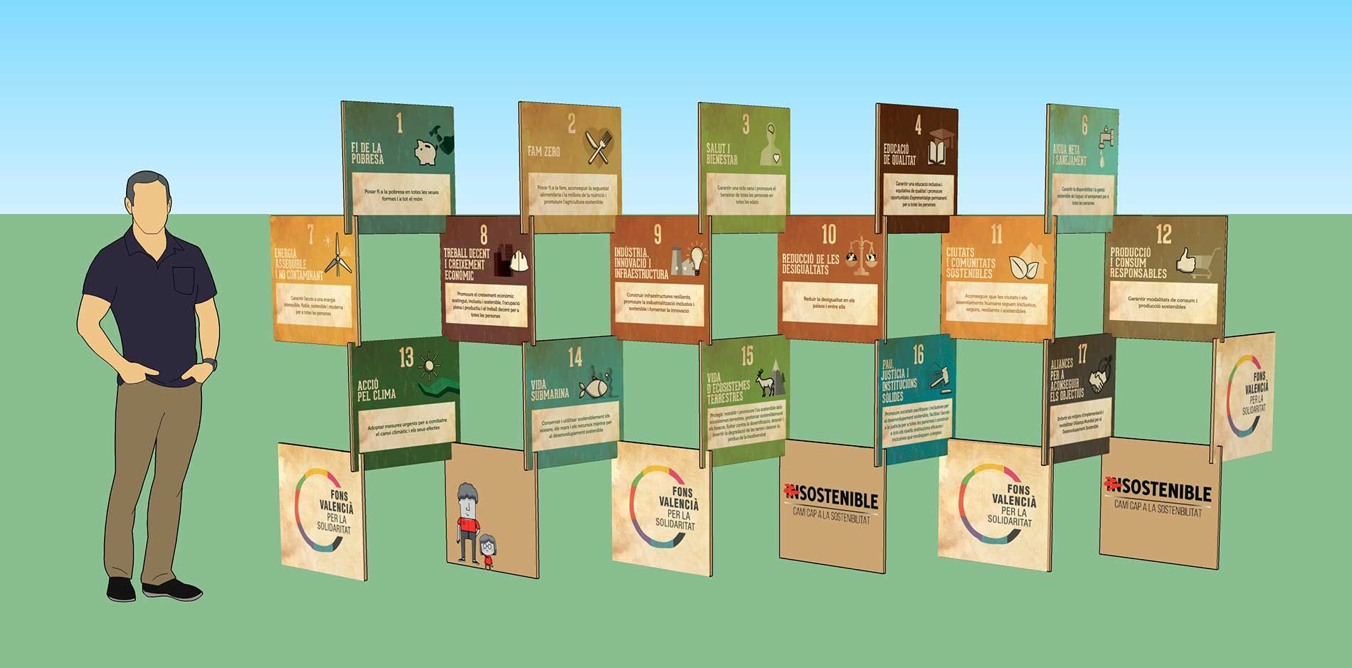 A modo de “wall” se configuró una composición formada por recuadros que unos junto a otros creaban una estructura autoportante y con cierto juego tridimensional. En cada uno del los cuadrados se mostraba información sobre los diferentes Objetivos de Desarrollo Sostenible. Esta sección tiene su función de resumir en un solo vistazo el global de los Objetivos y que los visitantes se lleven la impresión de que este punto es solo una parte de todas las acciones que podemos desarrollar para mejorar nuestro planeta.