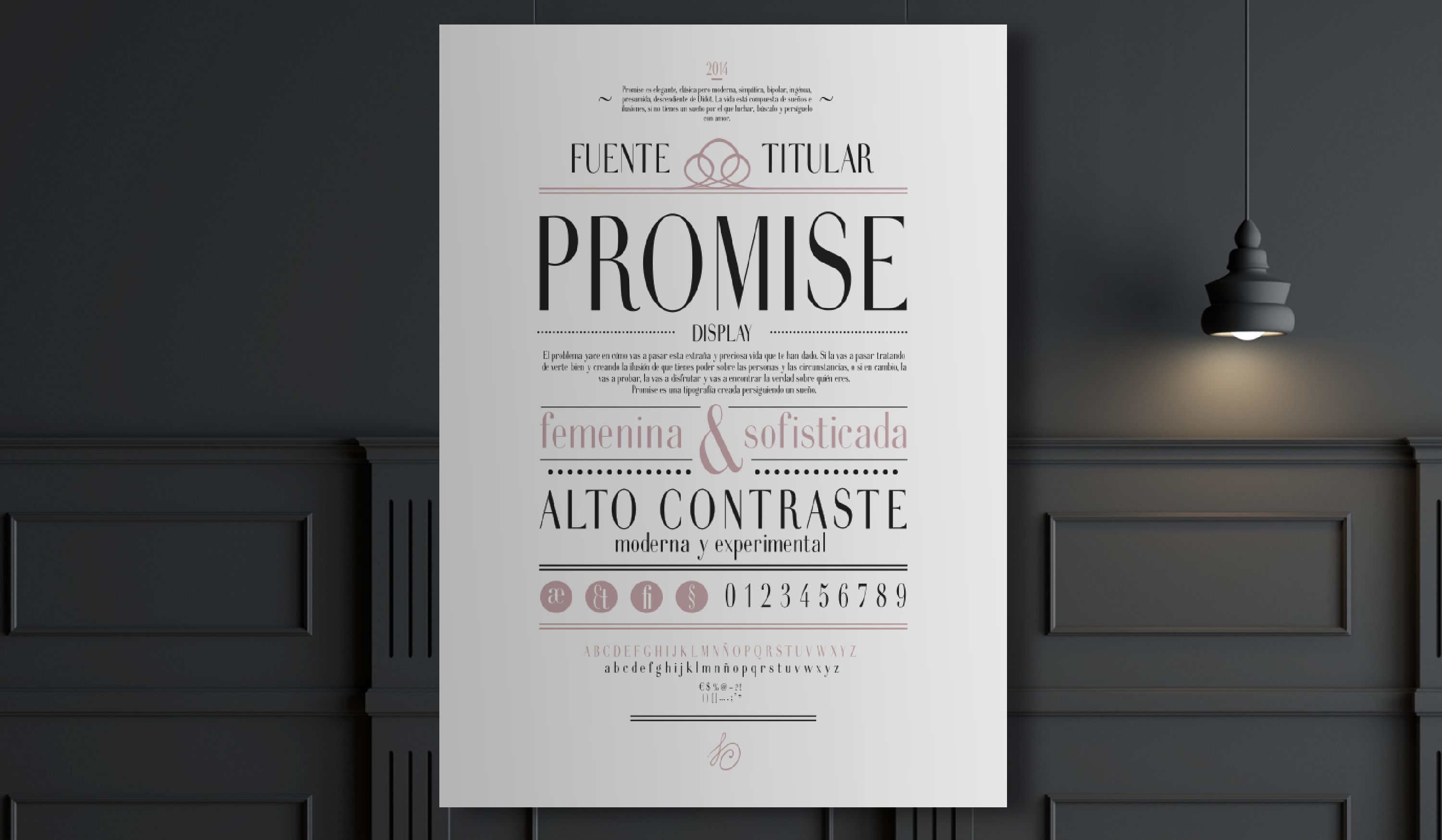 Promise es una fuente tipográfica Open Type. Fue inspirada por la clásica y eterna Didot. Siendo más condensada, moderna y de palo seco, Promise pretende ser una tipografía principalmente para titulares específicos en el sector de la moda y el lujo.