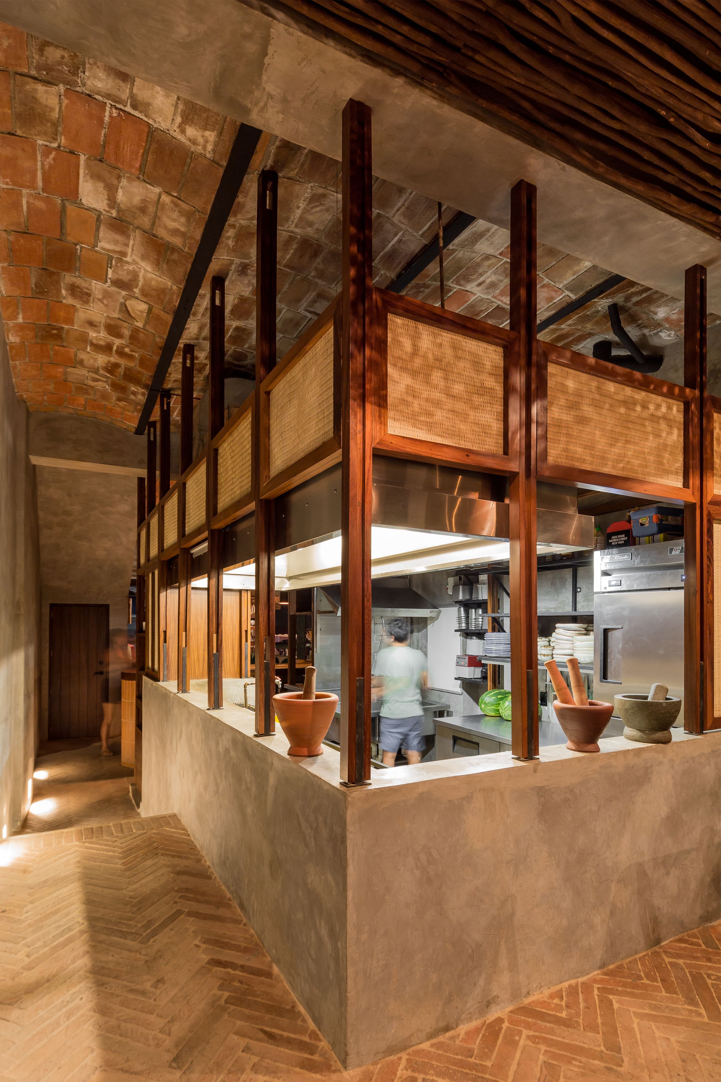 Mutfağın etrafını çevirmek için, parota ağacı ve hasır paneller kullanılarak hava ve ışığın içeri girmesine izin veren hafif bir çözüm tercih edildi. Yapı, alçak duvarlar üzerine oturtulmuş ve mutfak ana mekan haline gelmiştir. Restoranın ön ve arka bölümleri arasında bir bağlantı görevi görerek mutfak ile müşteriler arasında etkileşimi teşvik eder.