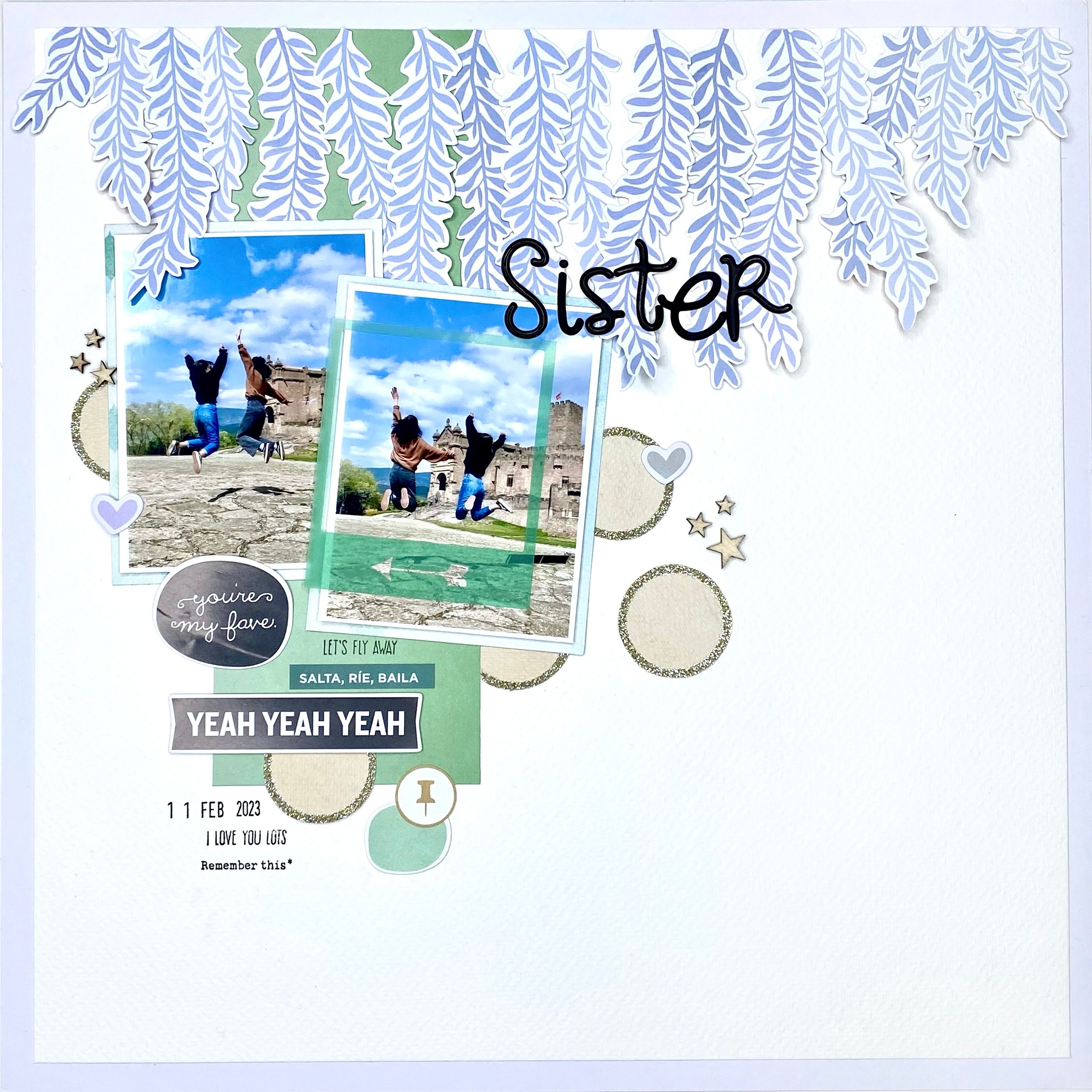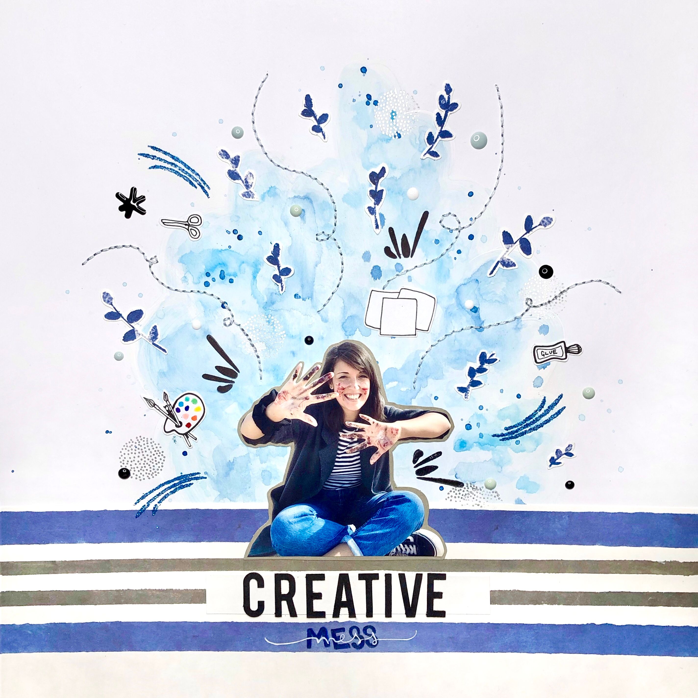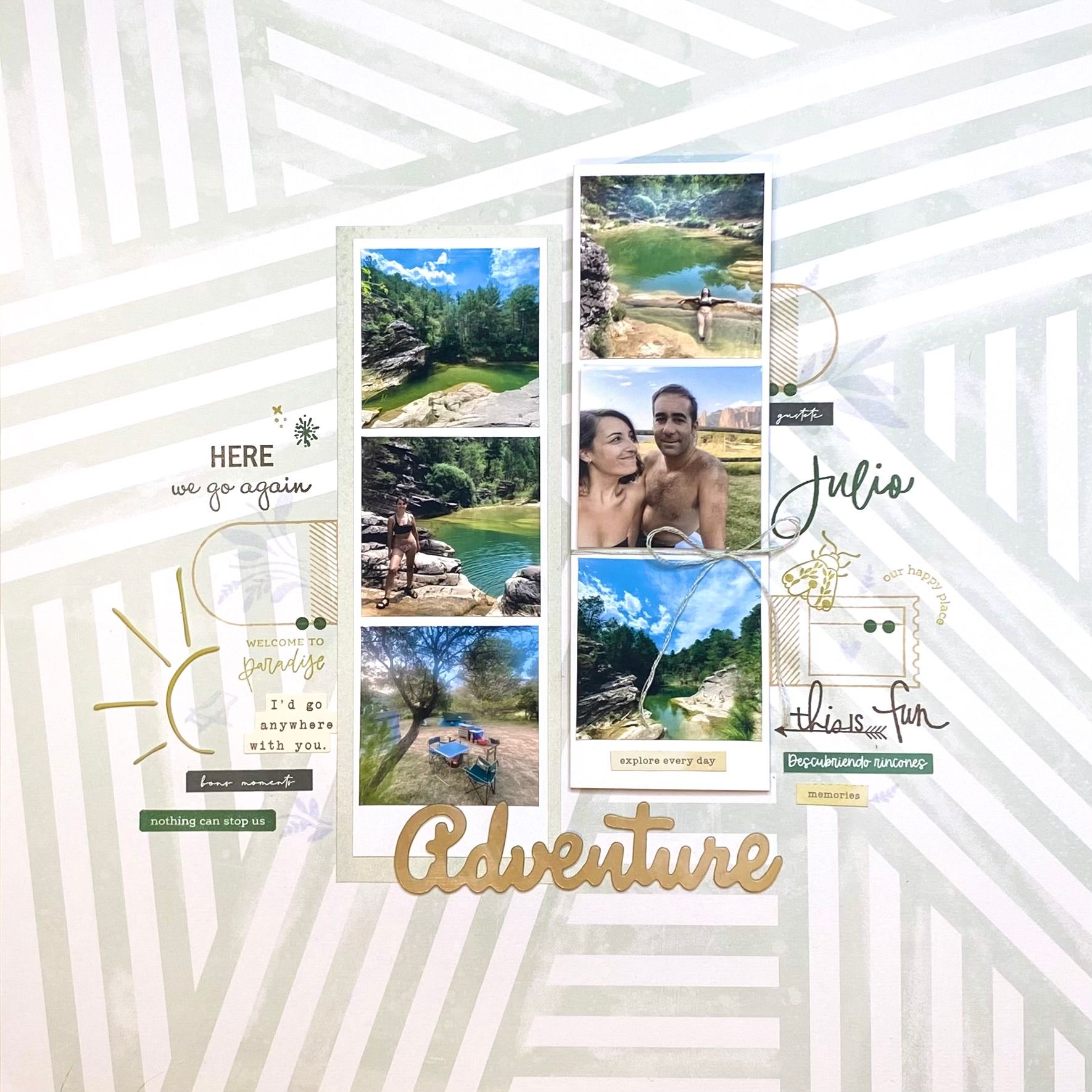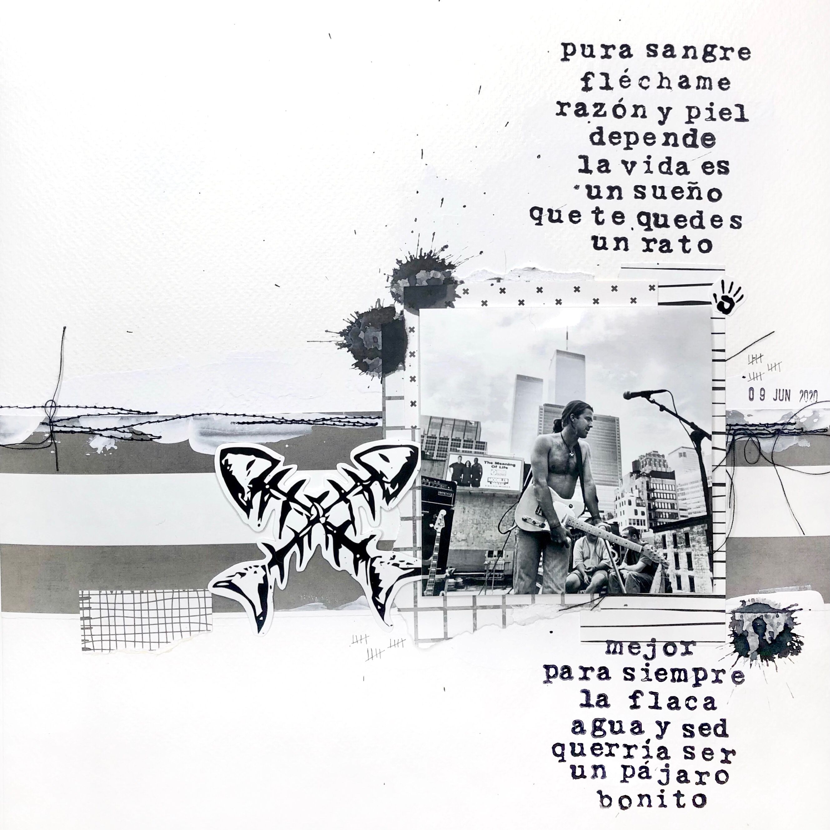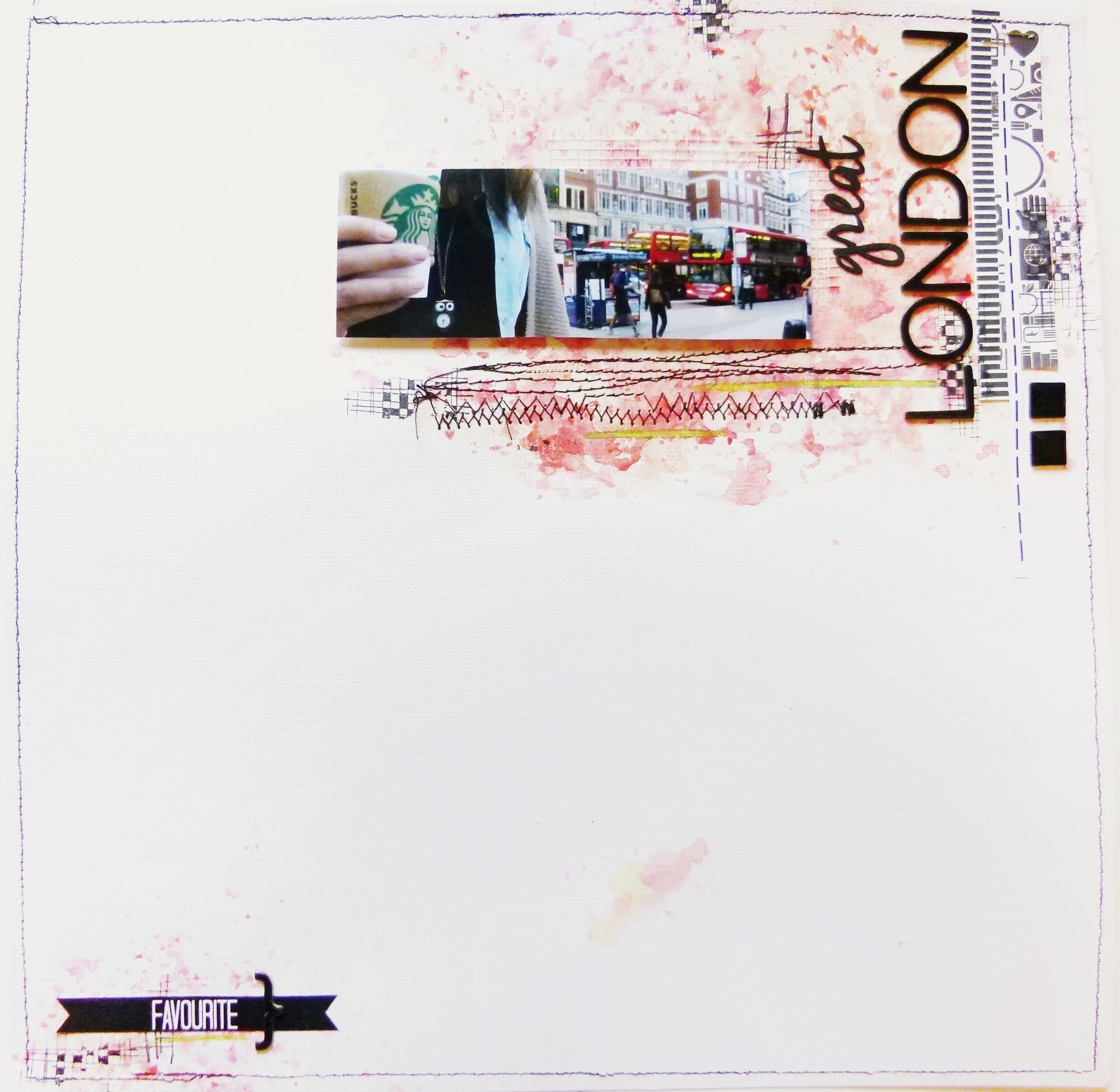 Layout "Great London" con fondo hecho con ceras acuarelables y sellos.Layout "Summer Pleasure" con fondo de acrílicas y tinta china.Layout "Perfect Combo" con fondo hecho con acuarelas y sellos estampados con la técnica de embossing.Cuadro "Sensei" con fondo de acrílicos y acuarela.