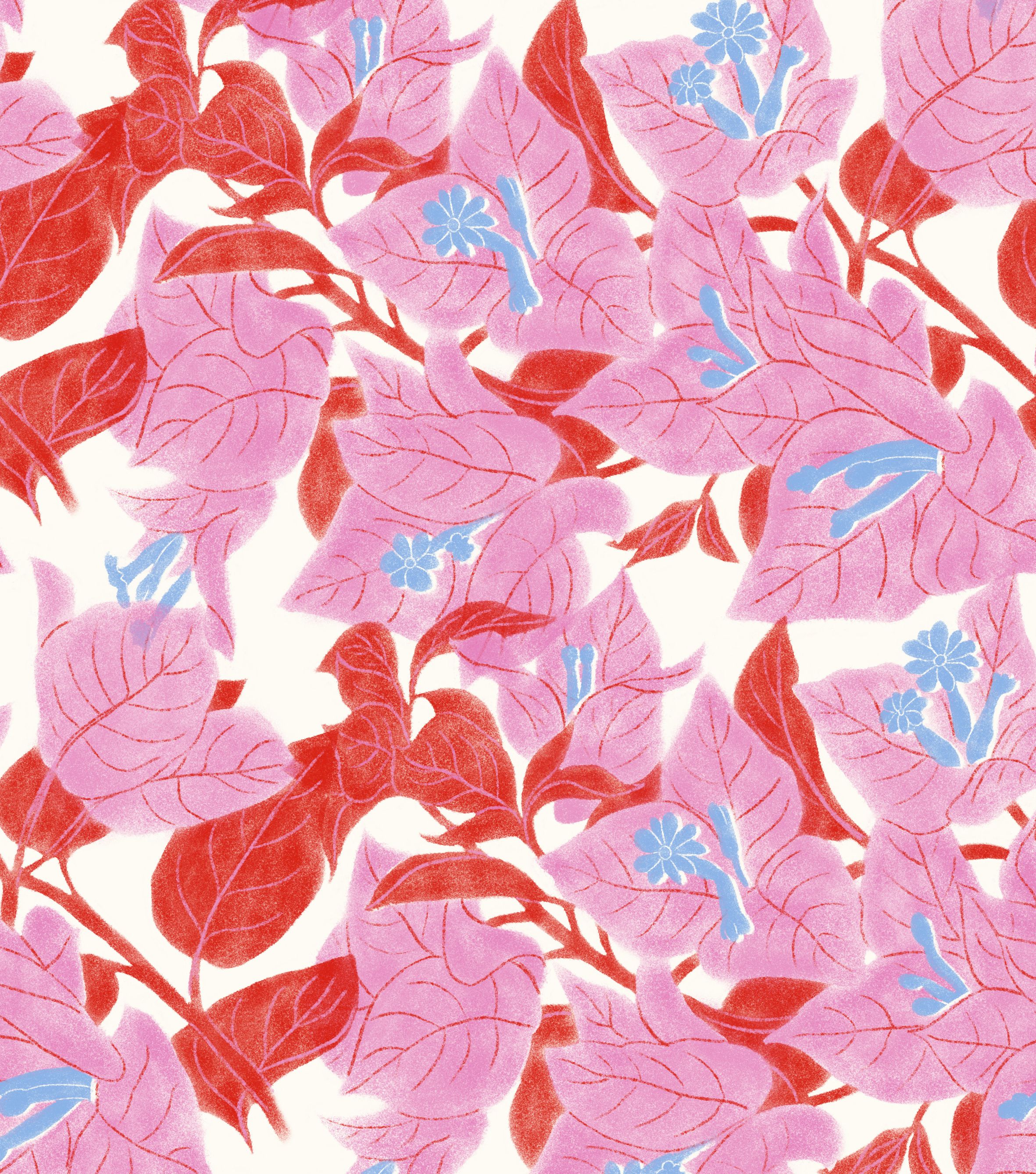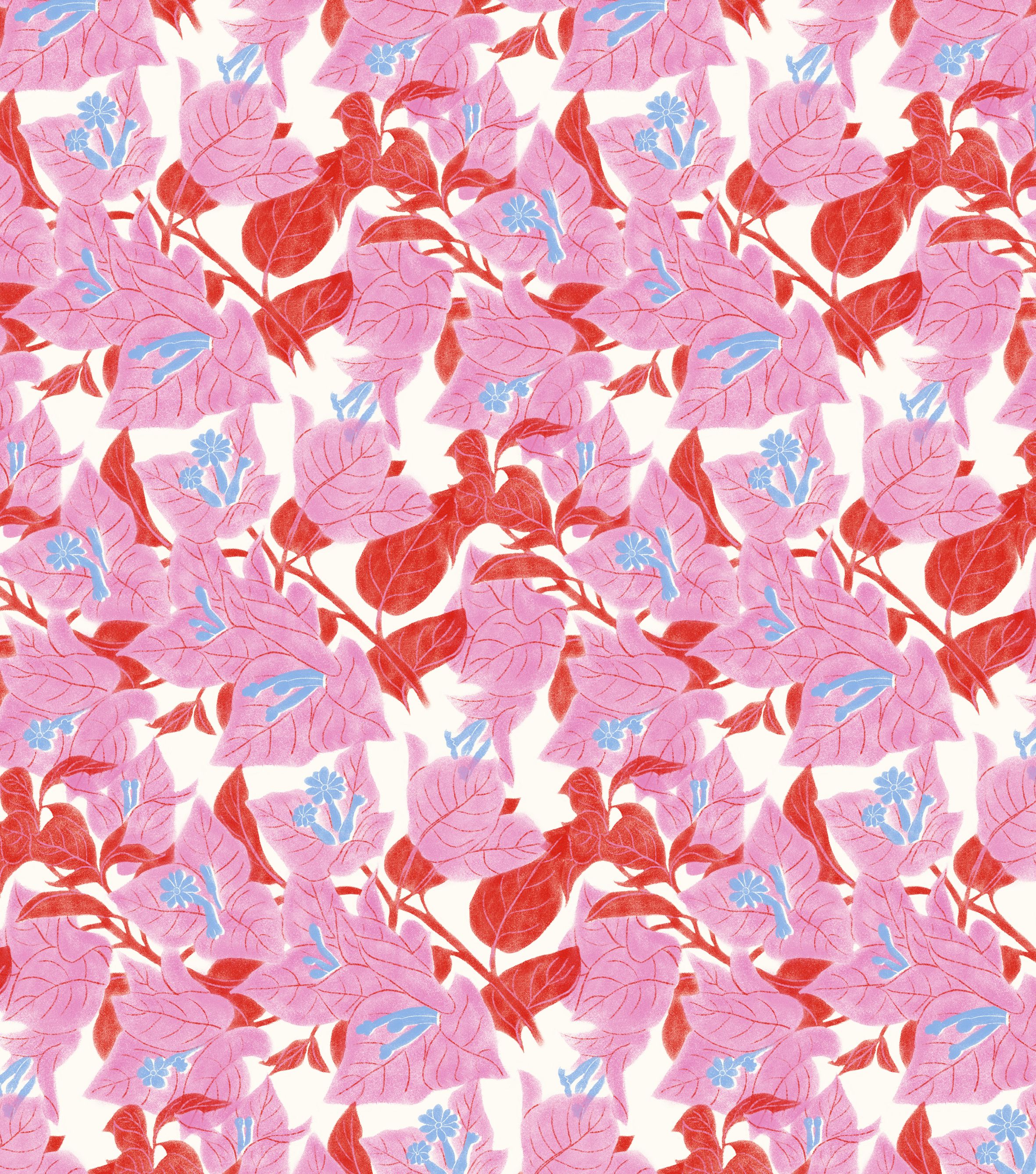 BUGANVILLA es un proyecto personal de estampado floral inspirado en la planta del mismo nombre. La textura, el contraste de color y el registro movido proporcionan a este estampado un aire retro y nostálgico actualizado.