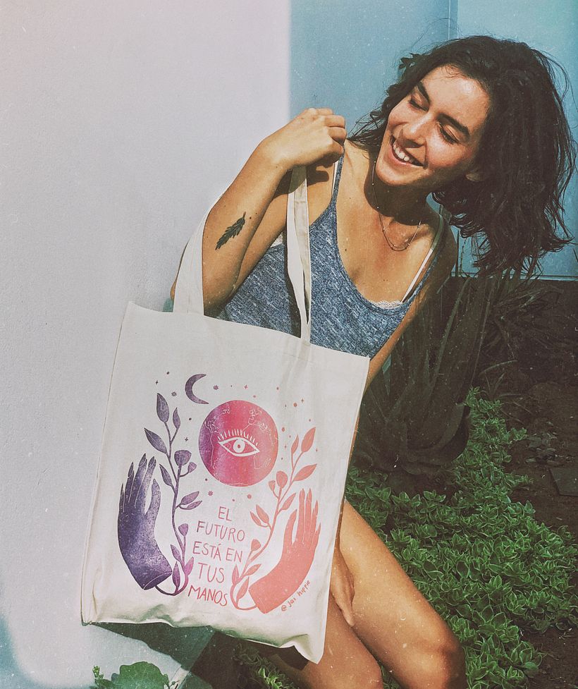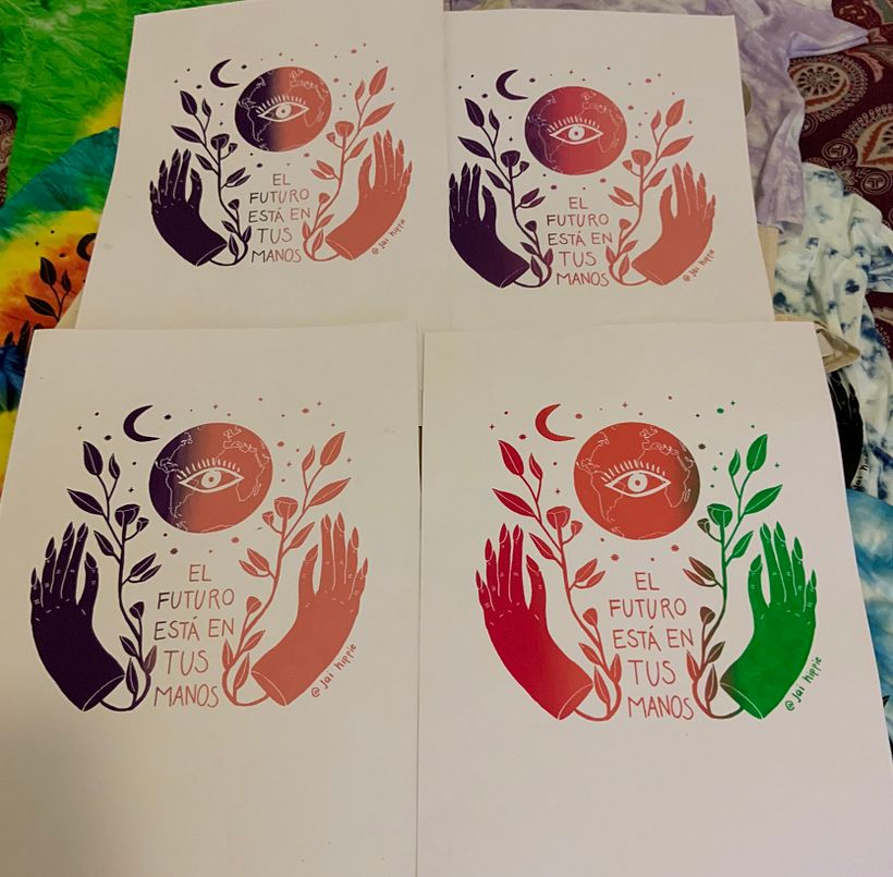 Quise estampar prendas (aunque hice también pruebas en papel) con un solo fotolito. Sobre los polos de fondo oscuro solo use 1 color al estampar y en las bolsas de fondo claro y el papel use un degradado de 2 o 3 tonos. Lo que aprendí es que 3 tonos queda más interesante y que puedo usar colores sin necesidad de usar varias capas. 😎