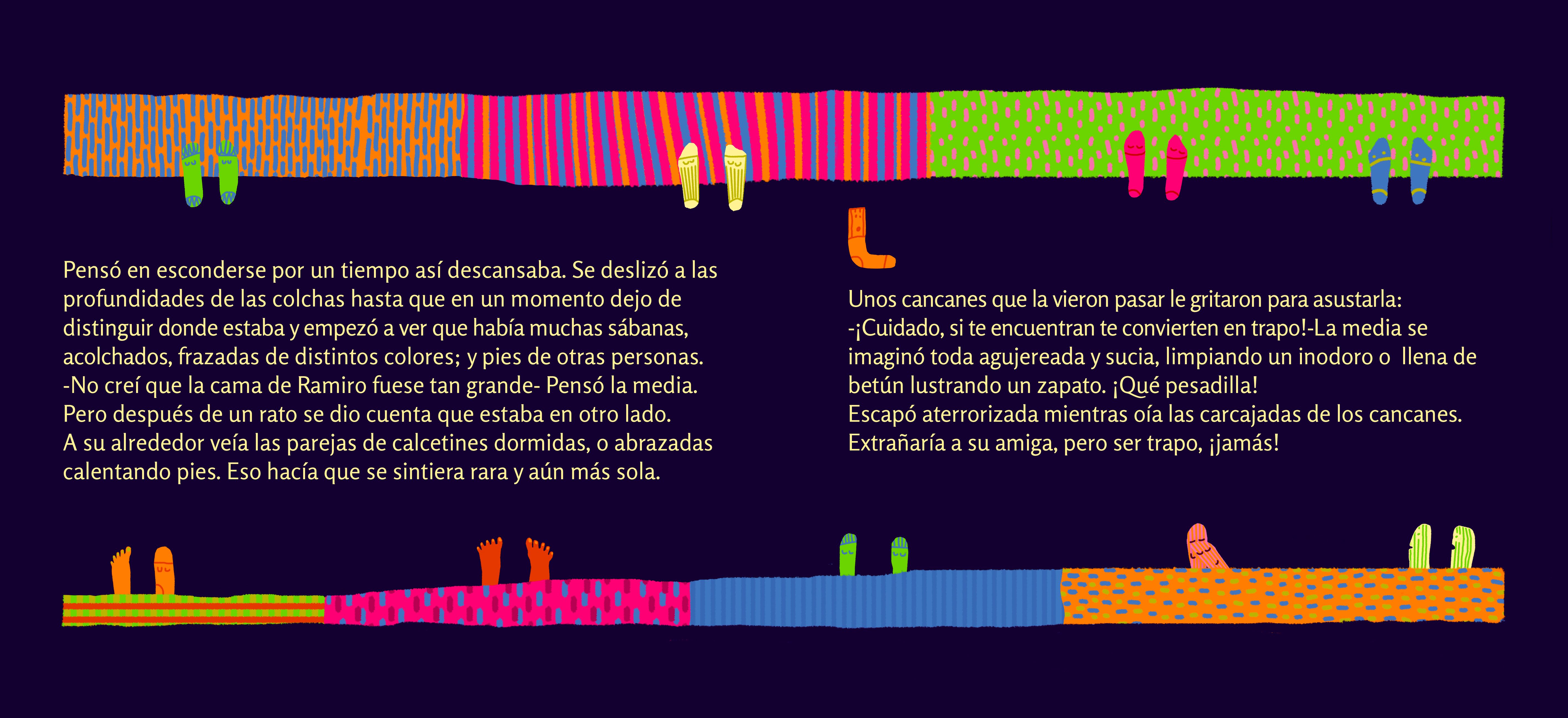 Tengo muchísimas dudas con él, desde el mismísimo título elegido hasta la historia. Incluso las ilustraciones (quise hacer unas ilustraciones con reminiscencias del arte textil andino, pero por esa manera de dibujar cuadrada que tiene el diseño textil, que también lo tienen las medias con ilustraciones) me generan dudas porque no se si queda monótonono, dado que todas las ilustraciones son todos planos generales. Bienvenida son todas las opiniones.