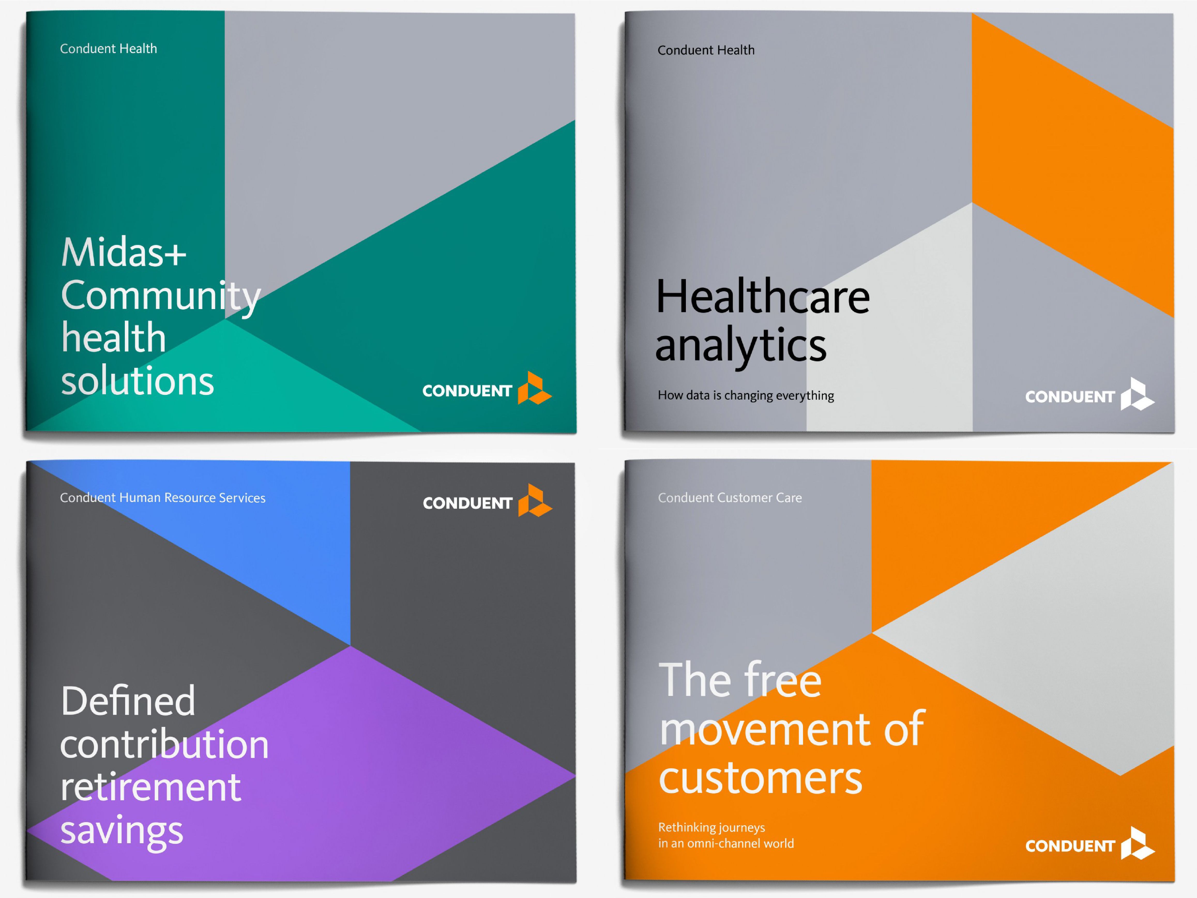 The new company needed a visual identity that would establish the brand quickly for its various audiences and would be distinct both from previous corporate entities and from the rest of the sector. The Conduent symbol is composed of three parallelograms coming together, representing the relationship between Conduent, its clients, and their customers. This configuration creates a forward-pointing arrow at the core of the design. Together with a bold, confident wordmark, the visual identity stands for a trusted, experienced company poised to hit the ground running.