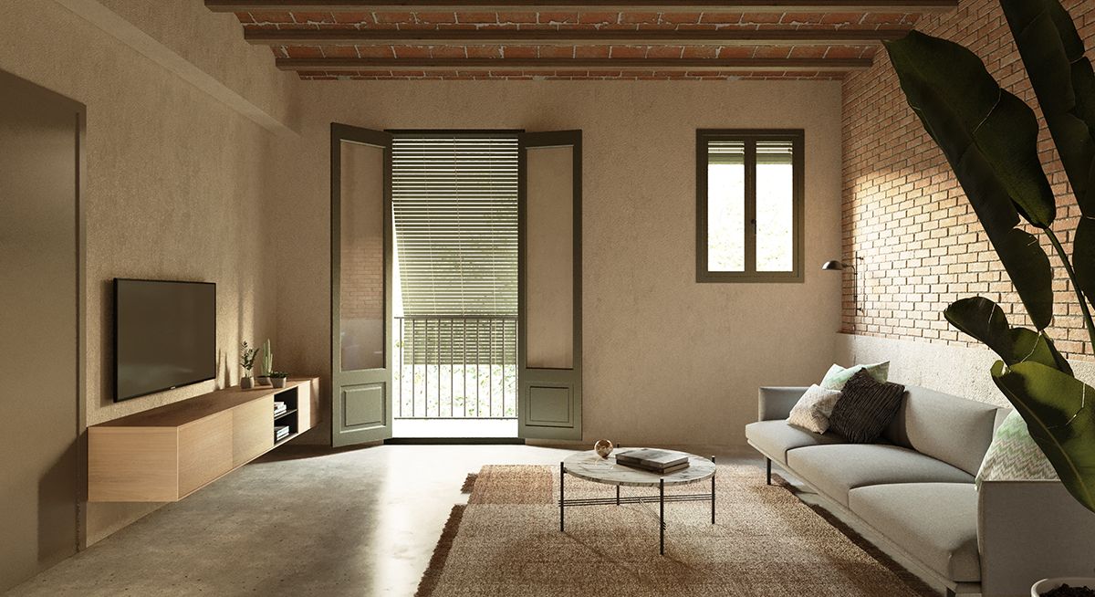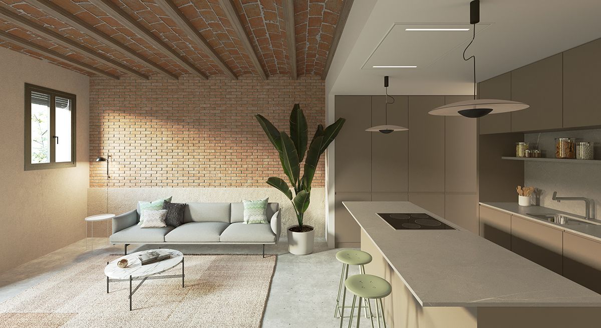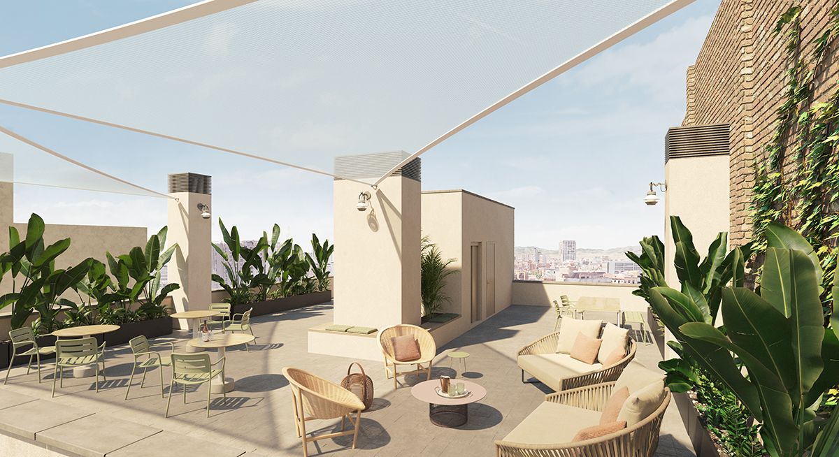 Se exponen los elementos constructivos originales del edificio en la composición final, combinándolos con materiales contemporáneos que realzan su particularidad. En la selección de materiales se ha escogido una gama de tonos terrosos, que se establece como hilo conductor desde el vestíbulo de acceso hasta la cubierta, unificando los espacios comunes con los más privados.