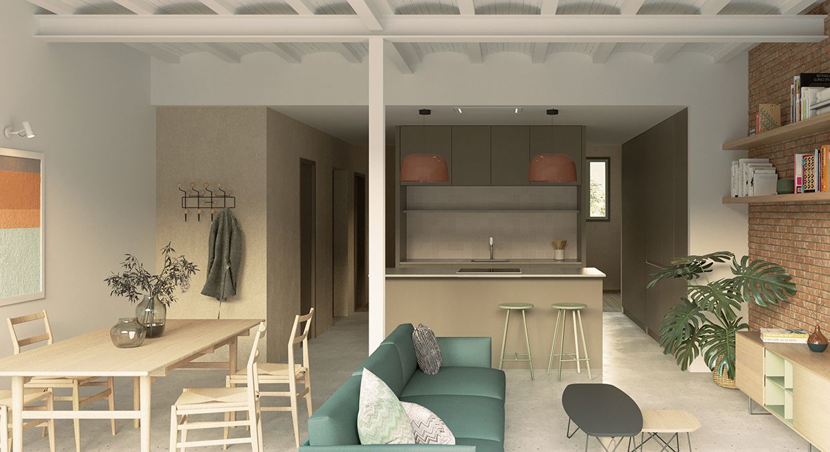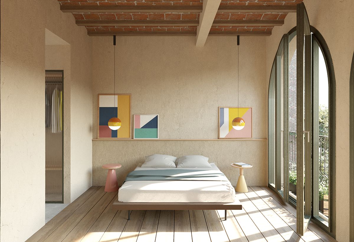 Binanın özgün yapı elemanları, özgünlüğünü artıran çağdaş malzemelerle bir araya getirilerek son kompozisyonda sergileniyor. Malzeme seçimi, giriş holünden çatıya kadar ortak bir tema oluşturan çeşitli toprak tonlarını içeriyor ve ortak alanları daha özel alanlarla bütünleştiriyor.