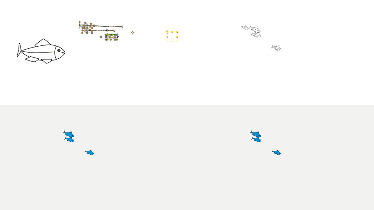 To add randomness to the shoal, we have used expression on each element, delayed the movements, add offsets and finally applied various colours tone to the fishes.