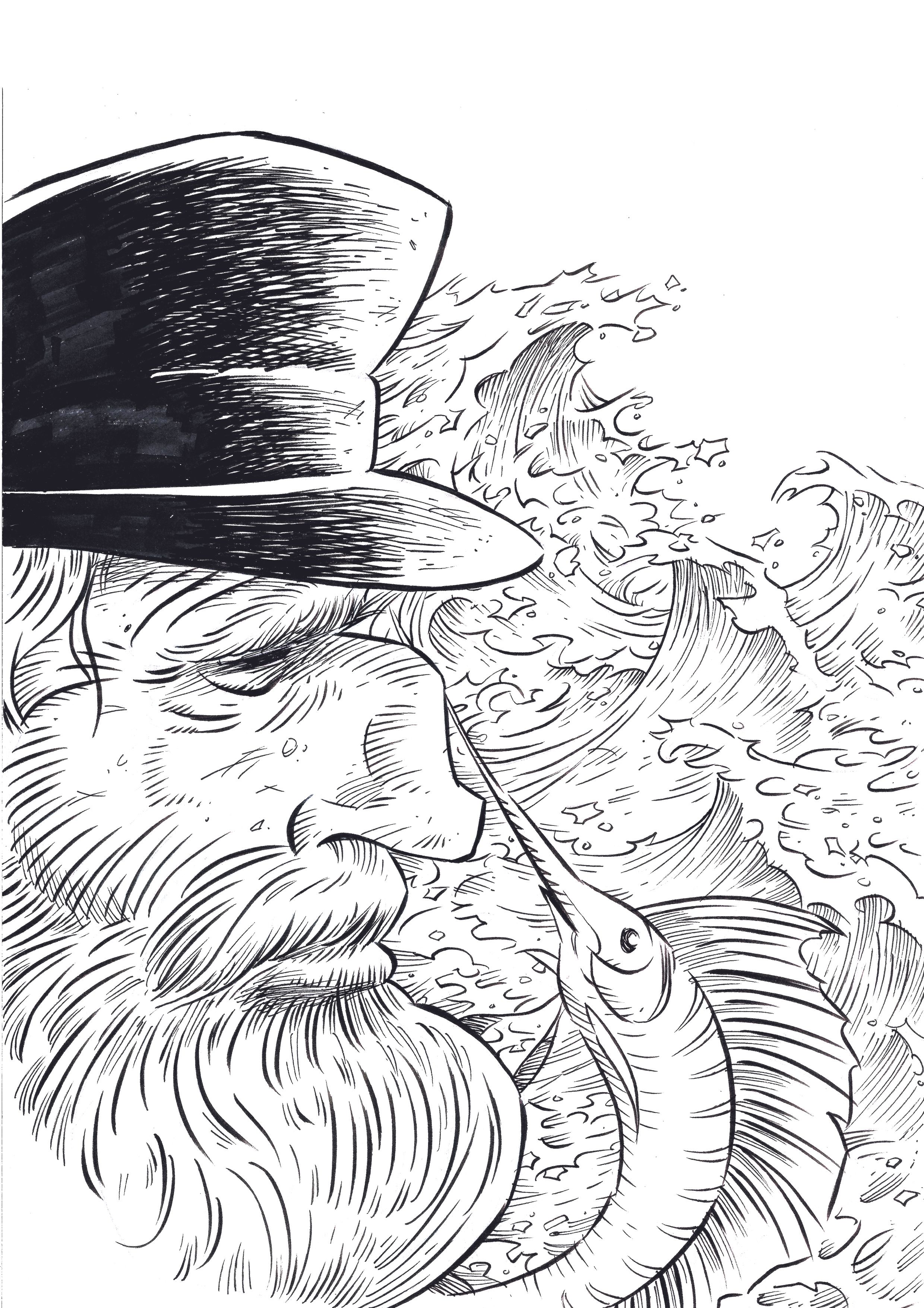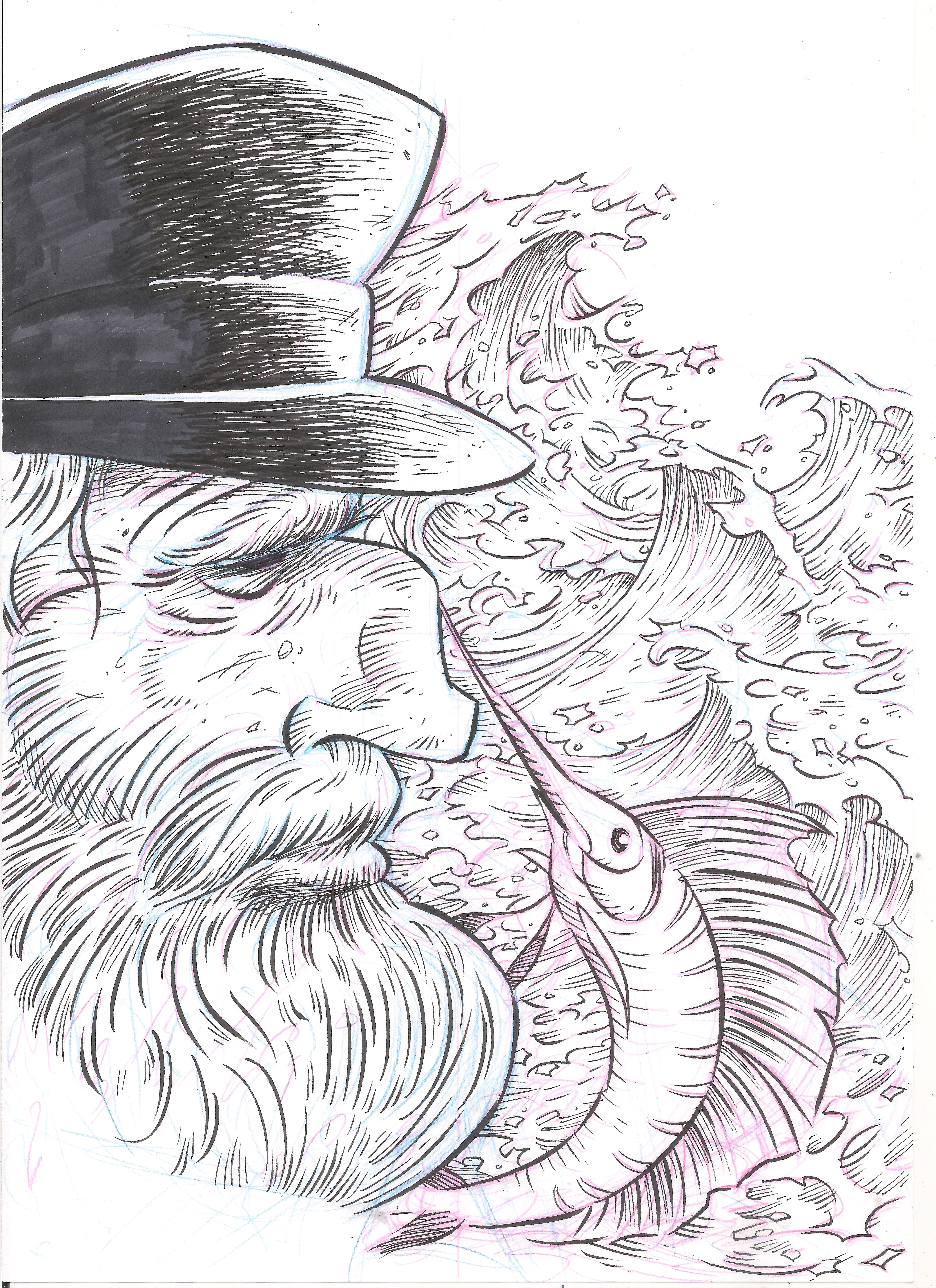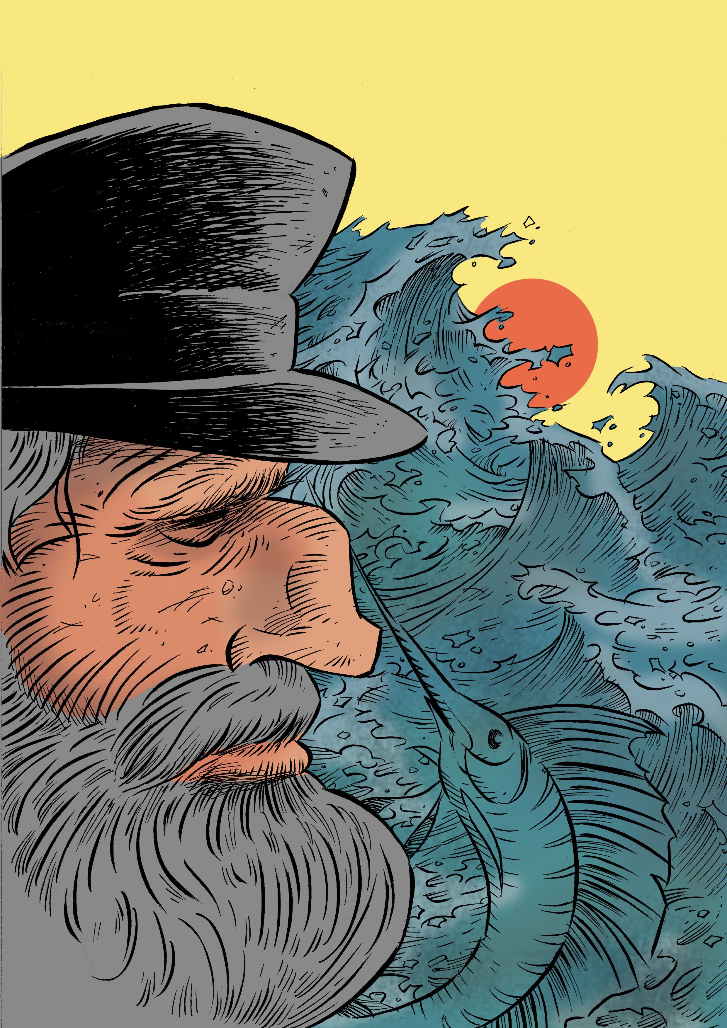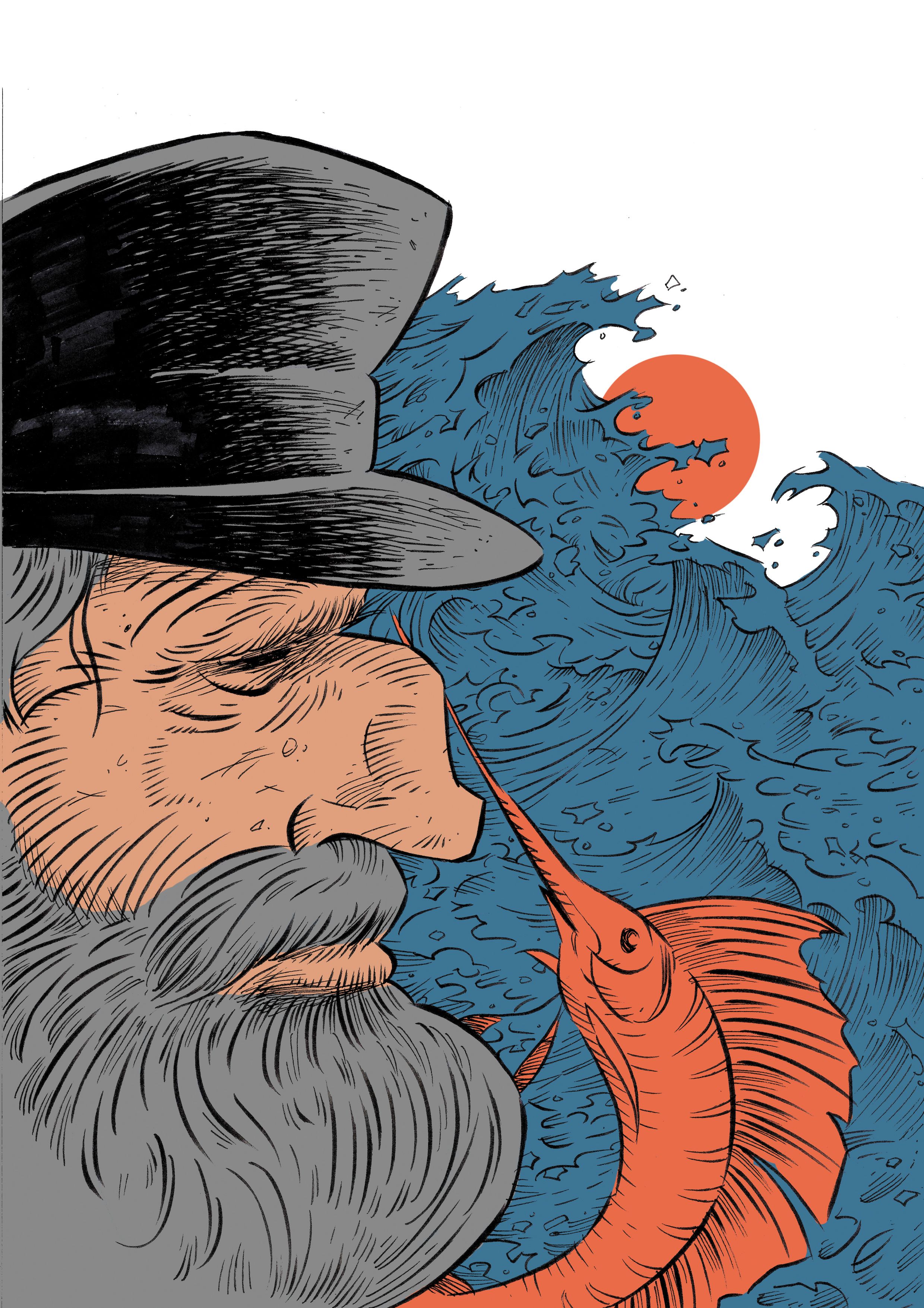 Portada para edición de El viejo y el mar. Proceso creativo a continuación:Boceto original con lápiz azulEntintado original. Definición de los tres elementos: viejo, mar y pez velaCapa del dibujo para trabajar en PhotoshopAñadido de color baseSombras y tonos dibujados con PhotoshopTonos cálidos para el fondo y tonos fríos para el mar, barba y gorra. Trabajo de definición de contornosAjuste de la ilustración terminada a las medidas de portada (15x23). Añadido de título y créditos.