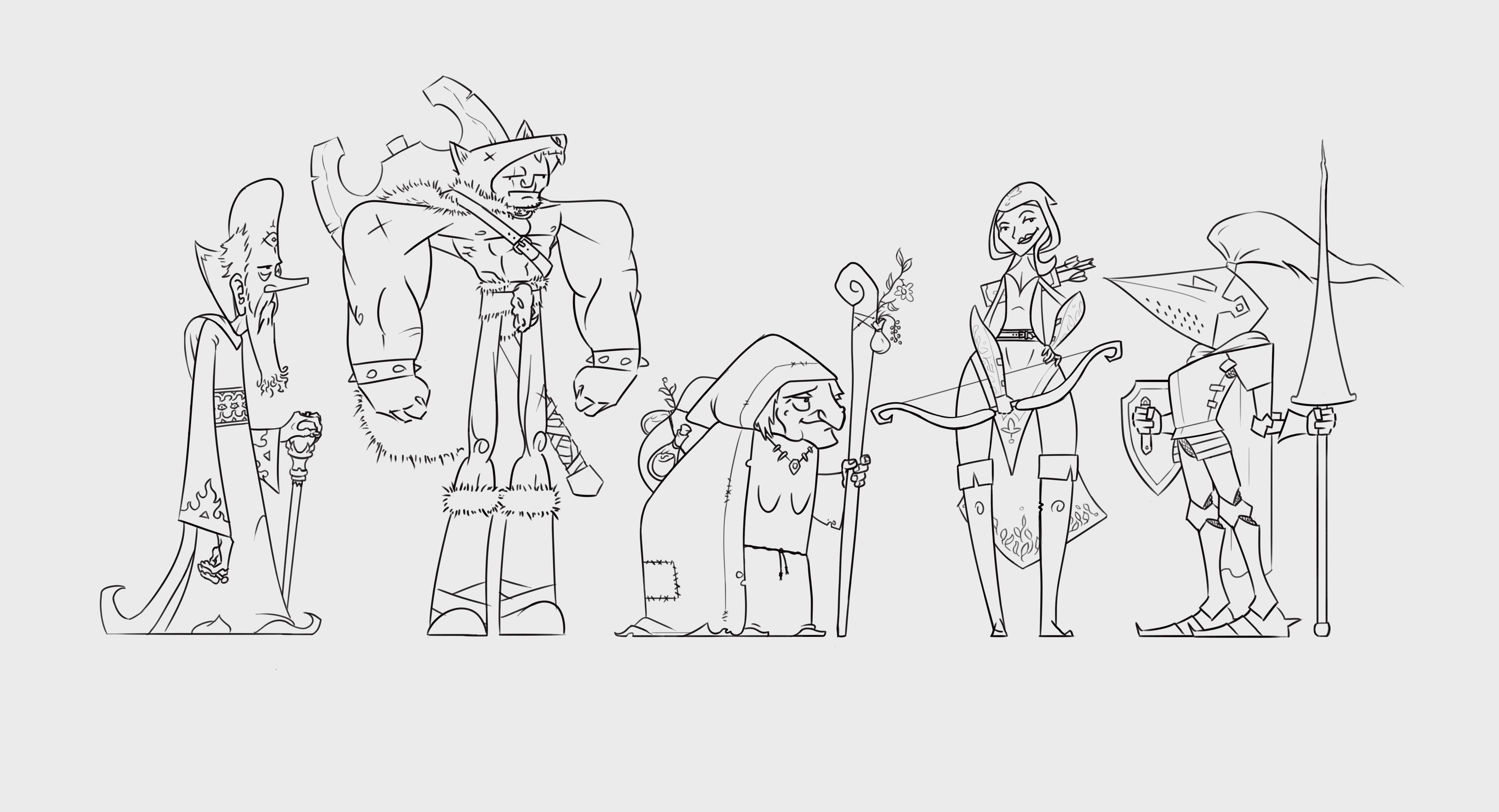 Comencé siguiendo los ejercicios planteados por Patricio Betteo en su curso, explorando formas con recortes para luego bocetar cuerpos con proporciones alocadas. Eso me permitió soltarme mucho en cuanto a la anatomia y darle enfasis a los razgos de cada personaje y su rol. Gracias a eso logré un lineup variado y con mucha personalidad.