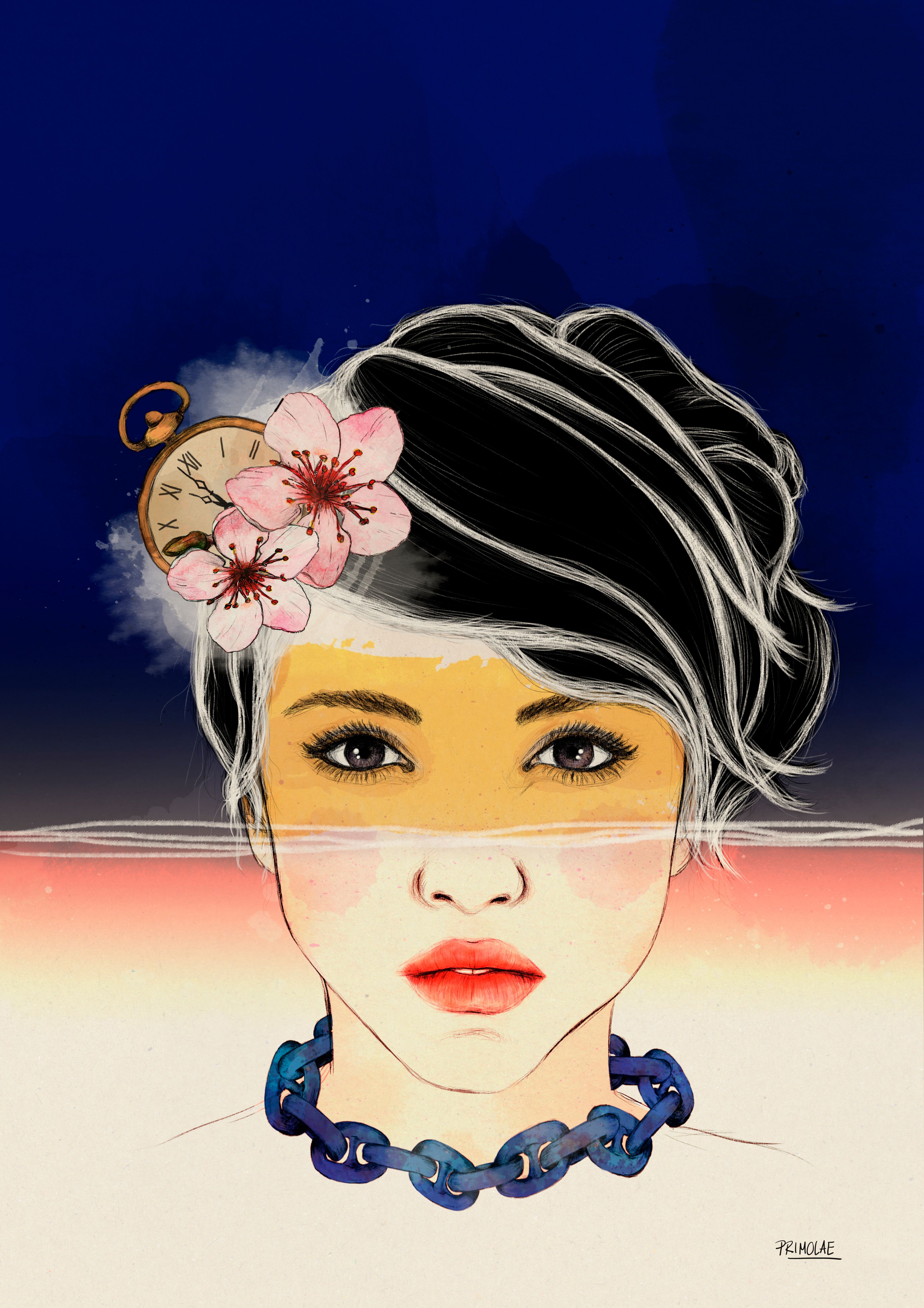 Inicialmente incluí otros elementos en la composición que al final sustituí porque no terminaba de encontrarle el lugar en el retrato. Las flores de cerezo son un escaneado de uno de mis cuadernos de bocetos, las escanee y decidí utilizarlas para este proyecto.
