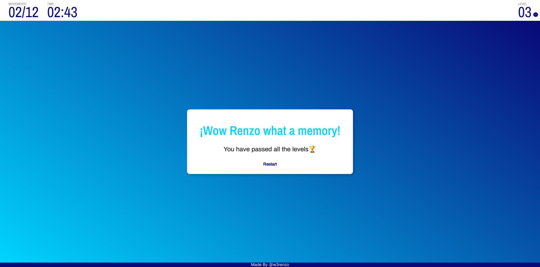 Hola este es mi proyecto de fin de curso, le realice algunas modificaciones como que cuando el juego inicia , por un breve periodo de tiempo se puede ver la posición de las cartas para que no sea solo adivinar . las pantallas de bienvenida y las de perdida están personalizas según el nombre del usuario que lo juega.