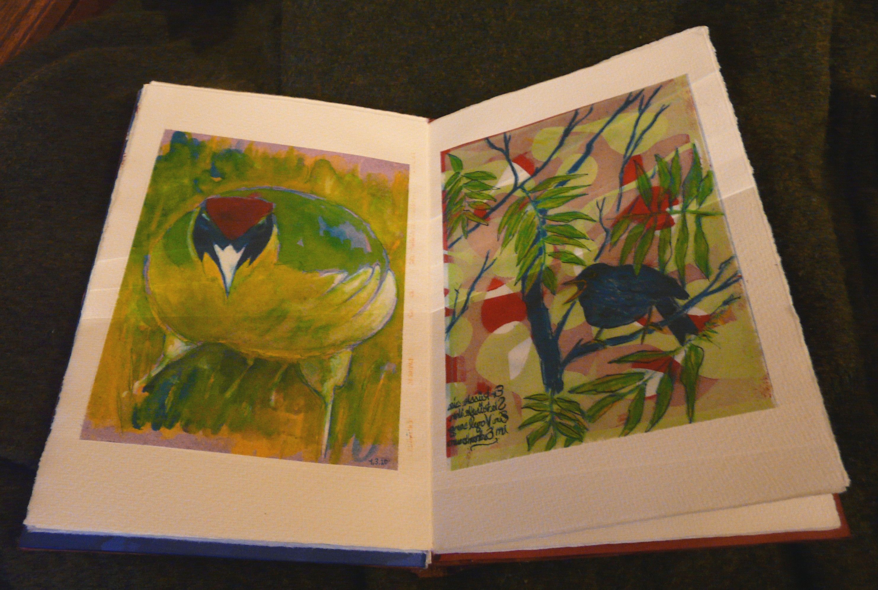 (please excuse my poor English) From Spring to Autumn I read a book of famous German Author Brigitte Kronauer: "The Beautiful, Shabby, Wavering". There are more than 30 short stories, Portraits of Persons, each linked to a specific bird. Every Sunday this year, I painted a bird after one of these stories. Here is a small selection of my birds, in my first try of binding a book. So it is not perfect (last side i bound upside down! Ooops!!), I enjoyed the course very much. Thanks to Susanna Dominguez Martin, you are such a wonderful teacher!!!
