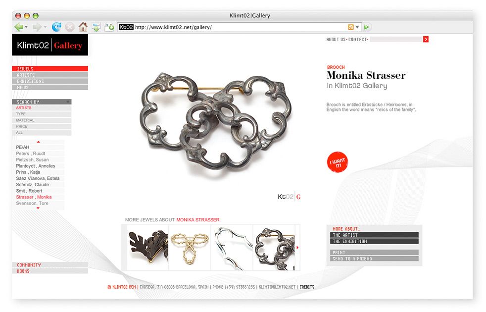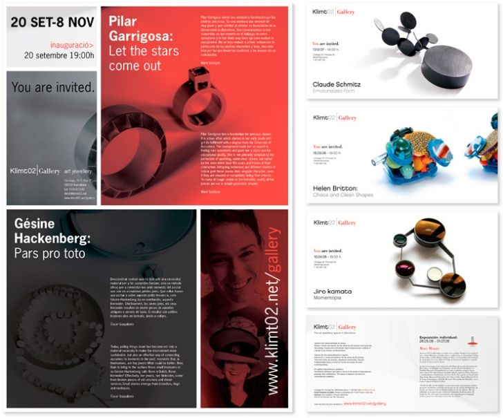 Klimt02|Gallery es una galería especializada en joyería contemporánea. El proyecto Klimt02|Gallery es una experiencia que abarca varios ámbitos: identidad corporativa, papelería, diseño editorial, diseño web, diseño gráfico aplicado al espacio, etc.